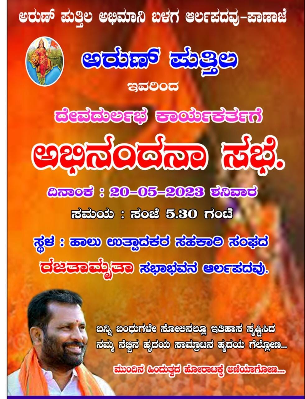 ಪಾಣಾಜೆ : ಅರುಣ್ ಪುತ್ತಿಲ ರವರಿಂದ ಕಾರ್ಯಕರ್ತರ ಅಭಿನಂದನಾ ಸಭೆ ಆರ್ಲಪದವು-ಪಾಣಾಜೆಯಲ್ಲಿ ಮೇ.20 ರಂದು ನಡೆಯಲಿದೆ.
