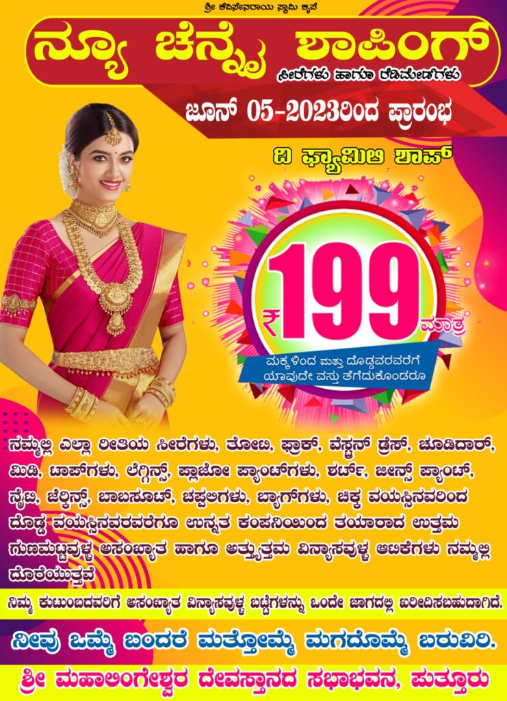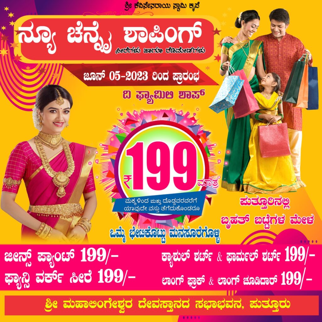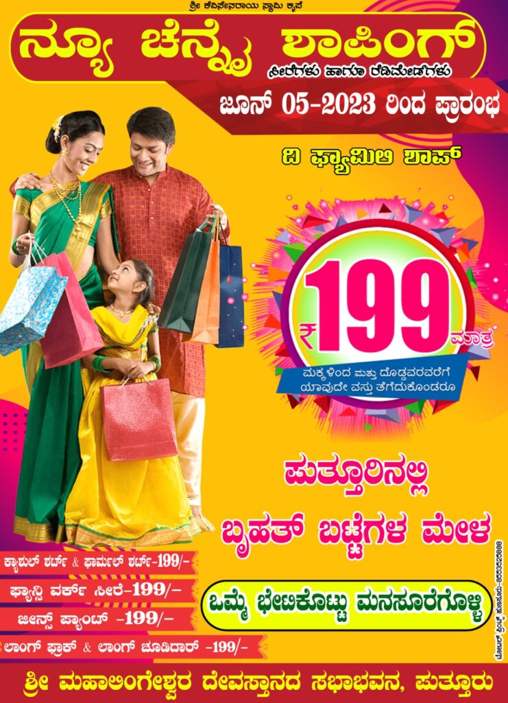 ಹೌದು. ಪುತ್ತೂರು ಶ್ರೀ ಮಹಾಲಿಂಗೇಶ್ವರ ದೇವಸ್ಥಾನದ ಸಭಾಭವನದಲ್ಲಿ ‘ನ್ಯೂ ಚೆನ್ನೈಶಾಪಿಂಗ್’ ದಿ ಫ್ಯಾಮಿಲಿ ಶಾಪ್ ಬೃಹತ್ ಬಟ್ಟೆಗಳ ಮೇಳ ಮೇಳೈಸಲಿದೆ.