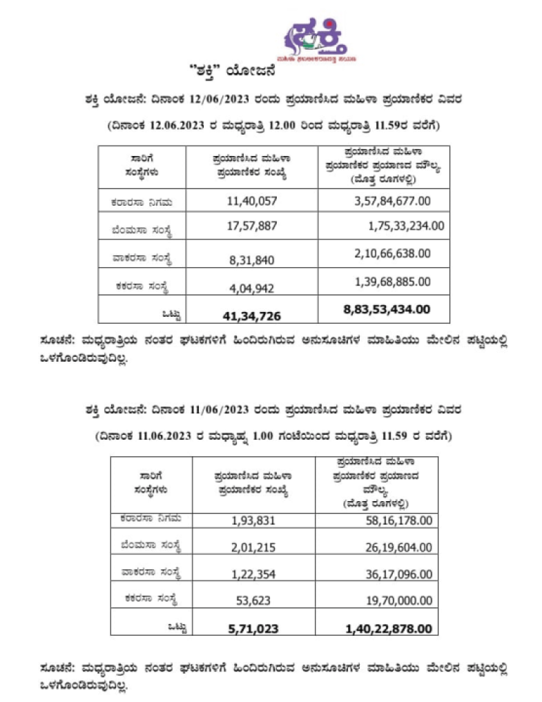 ಶಕ್ತಿ ಯೋಜನೆ : ನಿನ್ನೆ 41.34 ಲಕ್ಷ ಮಹಿಳೆಯರಿಂದ ಪ್ರಯಾಣ : ಸರ್ಕಾರ ಪಾವತಿಸಬೇಕು 8.83 ಕೋಟಿ ರೂ.