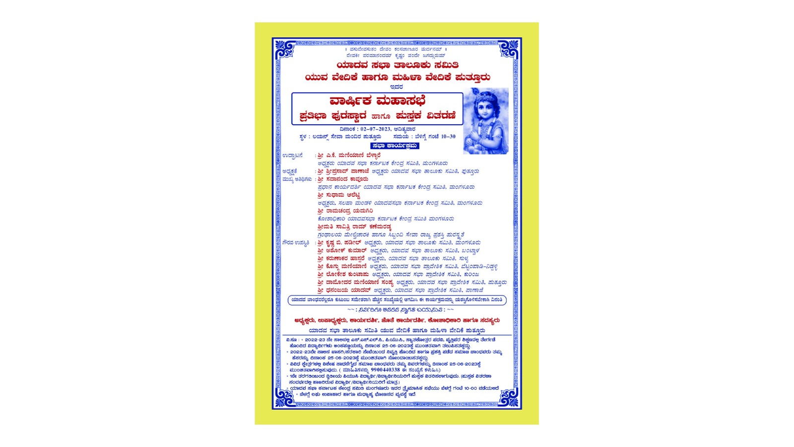 ಕಾರ್ಯಕ್ರಮದ ಅಧ್ಯಕ್ಷತೆಯನ್ನು ಪುತ್ತೂರು ತಾಲೂಕು ಯಾದವ ಸಭಾ ಸಮಿತಿಯ ಅಧ್ಯಕ್ಷರಾದ ಶ್ರೀಪ್ರಸಾದ್ ಪಾಣಾಜೆ ರವರು ವಹಿಸಲಿದ್ದಾರೆ.