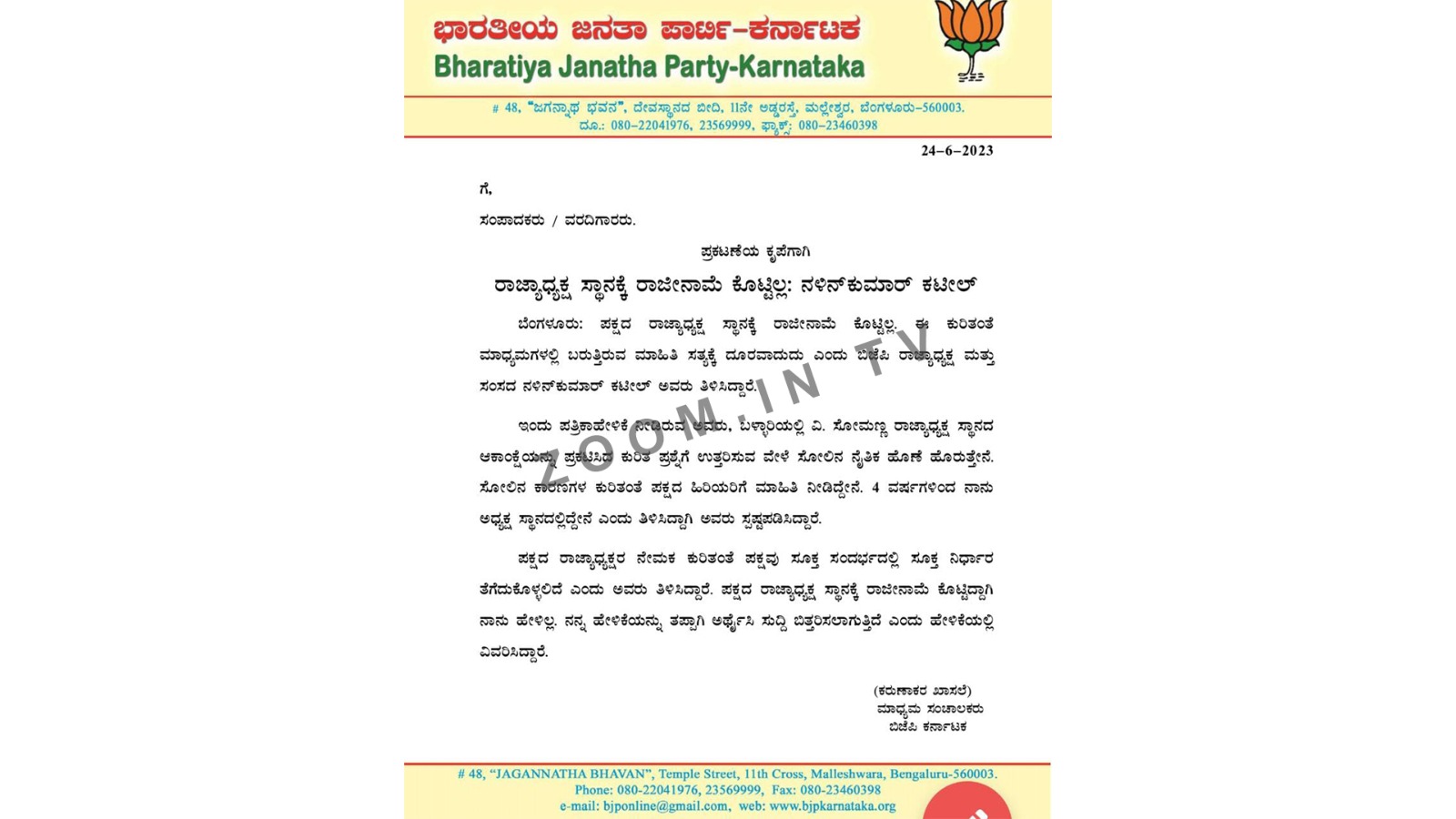ಪಕ್ಷದ ರಾಜ್ಯಾಧ್ಯಕ್ಷ ಸ್ಥಾನಕ್ಕೆ ರಾಜೀನಾಮೆ ಕೊಟ್ಟಿದ್ದಾಗಿ ನಾನು ಹೇಳಿಲ್ಲ. ನನ್ನ ಹೇಳಿಕೆಯನ್ನು ತಪ್ಪಾಗಿ ಅರ್ಥೈಸಿ ಸುದ್ದಿ ಬಿತ್ತರಿಸಲಾಗುತ್ತಿದೆ ಎಂದು ಹೇಳಿಕೆಯಲ್ಲಿ ವಿವರಿಸಿದ್ದಾರೆ.