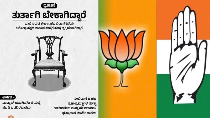 ಕುರ್ಚಿಯ ಫೋಟೋ ಒಂದನ್ನು ಹಾಕಿ ಗೇಲಿ ಮಾಡಿರುವ ಕಾಂಗ್ರೆಸ್, ‘ಇದು ಪ್ರಕಟಣೆ: ತುರ್ತಾಗಿ ಬೇಕಾಗಿದ್ದಾರೆ’ ಎಂದು ಹೆಡ್ಡರ್ ಹಾಕಿದೆ. ಅದರ ಅಡಿಯಲ್ಲಿ ಖಾಲಿ ಇರುವ ಕರ್ನಾಟಕ ವಿಧಾನಸಭೆಯ ವಿರೋಧ ಪಕ್ಷದ ನಾಯಕ ಹುದ್ದೆಗೆ ಸೂಕ್ತ ವ್ಯಕ್ತಿ ಬೇಕಾಗಿದ್ದಾರೆ. ಅರ್ಹತೆ: ವಾಟ್ಸ್ಆ್ಯಪ್ ವಿವಿಯಲ್ಲಿ ಪದವಿ ಪಡೆದಿರಬಾರದು. ಸಂವಿಧಾನ ಹಾಗೂ ಪ್ರಜಾಪ್ರಭುತ್ವದ ಮೌಲ್ಯ ತಿಳಿದಿರಬೇಕು. ಭ್ರಷ್ಟಾಚಾರ ಮಾಡಿರಬಾರದು ಎಂದು ಫೋಟೋ ಮೇಲೆ ಬರೆದಿದೆ.