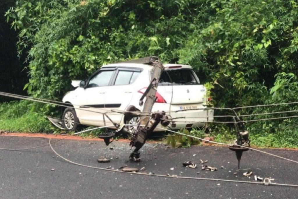 ವಿದ್ಯುತ್ ಕಂಬಕ್ಕೆ ಕಾರು ಗುದ್ದಿದ ರಭಸಕ್ಕೆ ಹೊಂಡದಿಂದಲೇ ವಿದ್ಯುತ್ ಕಂಬ ಮೇಲಕ್ಕೆದ್ದಿದೆ.