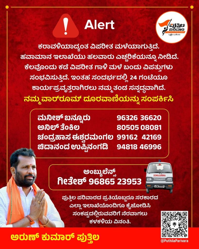 ವಿಪರೀತ ಮಳೆ ಸುರಿಯುತ್ತಿರುವ ಹಿನ್ನೆಲೆಯಲ್ಲಿ ಅರುಣ್ ಕುಮಾರ್ ಪುತ್ತಿಲ ಅವರ ಬೆಂಬಲಿಗರ ಪುತ್ತಿಲ ಪರಿವಾರದ ವಾರ್ ರೂಂ ಆರಂಭಿಸಲಾಗಿದೆ.