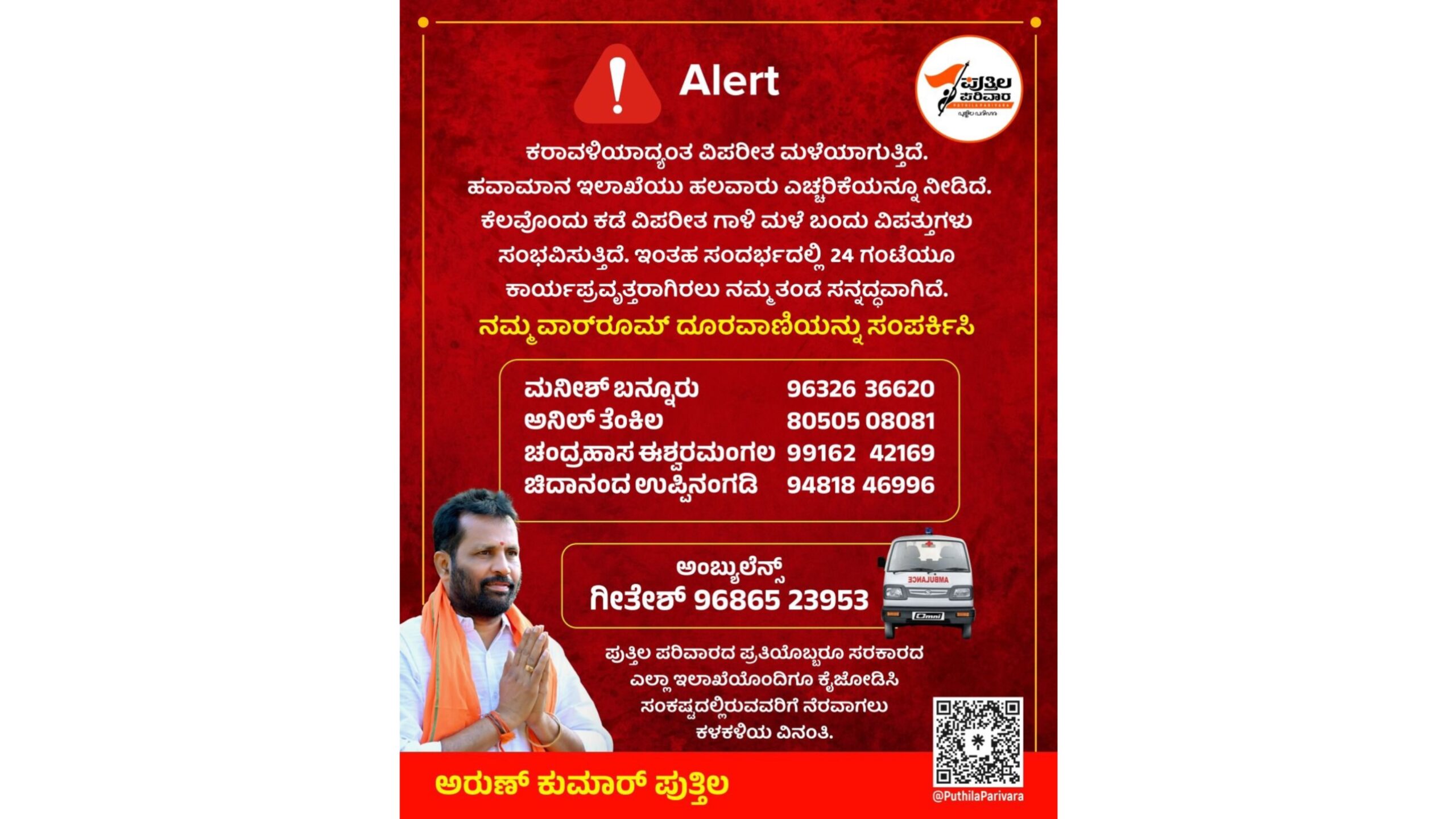 ವಿಪರೀತ ಮಳೆ ಸುರಿಯುತ್ತಿರುವ ಹಿನ್ನೆಲೆಯಲ್ಲಿ ಅರುಣ್ ಕುಮಾರ್ ಪುತ್ತಿಲ ಅವರ ಬೆಂಬಲಿಗರ ಪುತ್ತಿಲ ಪರಿವಾರದ ವಾರ್ ರೂಂ ಆರಂಭಿಸಲಾಗಿದೆ.