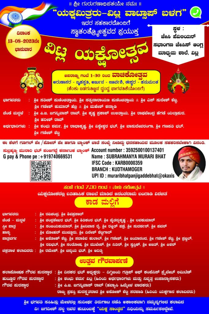 (ಆ.13) ವಿಟ್ಲ : ಸ್ವಾತಂತ್ರ್ಯೋತ್ಸವದ ಪ್ರಯುಕ್ತ ‘ವಿಟ್ಲ ಯಕ್ಷೋತ್ಸವ’  ಕಾರ್ಯಕ್ರಮ