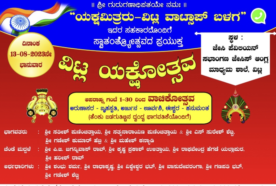 (ಆ.13) ವಿಟ್ಲ : ಸ್ವಾತಂತ್ರ್ಯೋತ್ಸವದ ಪ್ರಯುಕ್ತ ‘ವಿಟ್ಲ ಯಕ್ಷೋತ್ಸವ’  ಕಾರ್ಯಕ್ರಮ
