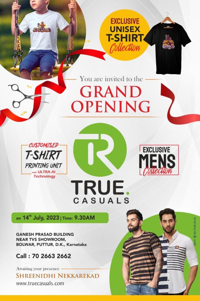 ಪುತ್ತೂರು : ಪುರುಷರ ಬಟ್ಟೆಗಳ ಮಳಿಗೆ ‘TRUE Casuals’ ಜು.14 ರಂದು ಬೊಳ್ವಾರಿನ ಗಣೇಶ್ ಪ್ರಸಾದ್ ಬಿಲ್ಡಿಂಗ್ ನಲ್ಲಿ ಶುಭಾರಂಭಗೊಳ್ಳಲಿದೆ.