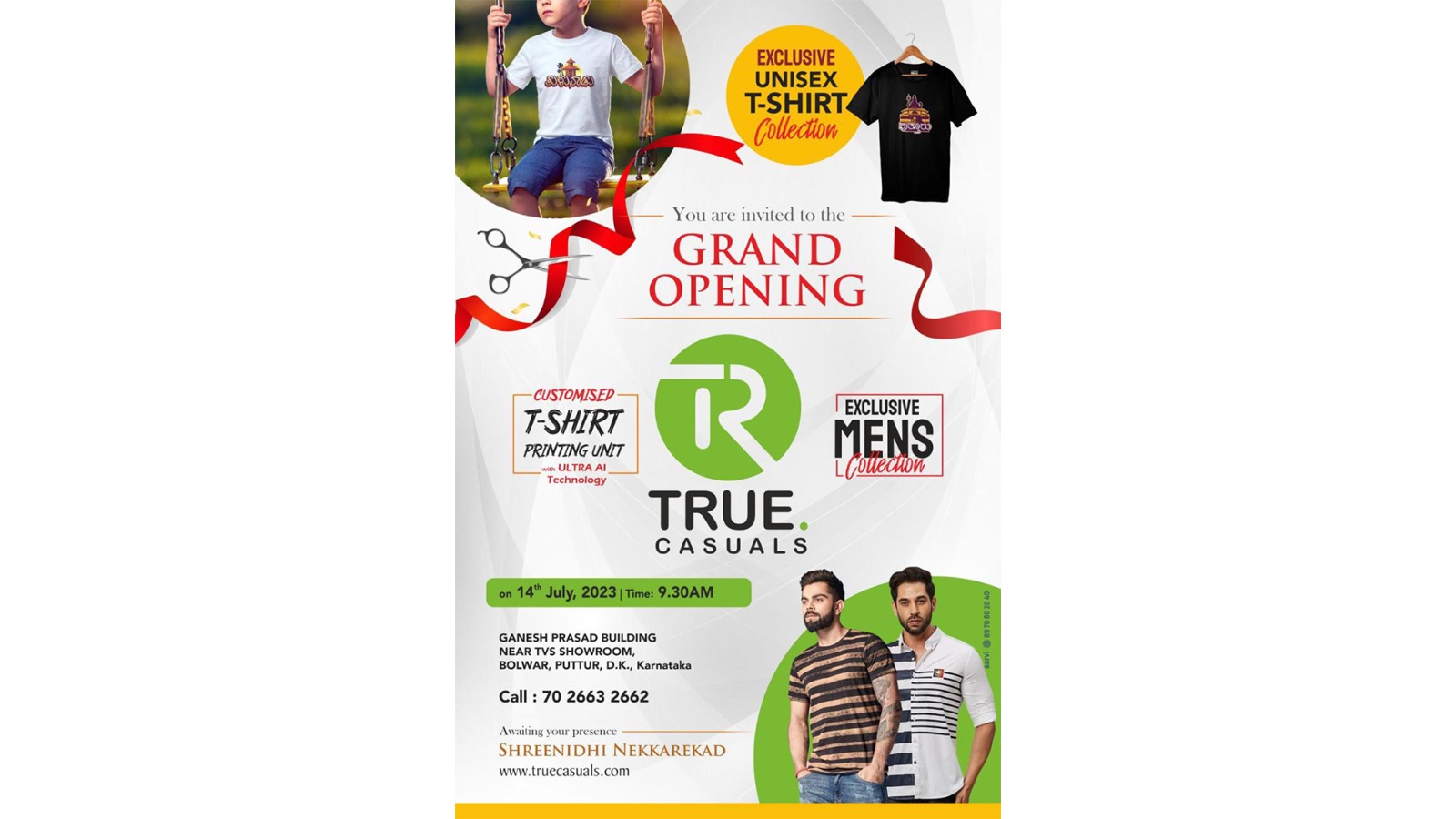 ಪುರುಷರ ಎಕ್ಸ್ಕ್ಲೂಸಿವ್ ಬಟ್ಟೆಗಳ ಸಂಗ್ರಹ, ಕಸ್ಟಮೈಸ್ಡ್ ಟೀ-ಶರ್ಟ್ ಪ್ರಿಟಿಂಗ್ ಯುನಿಟ್ ವಿಥ್ ಅಲ್ಟ್ರಾ AI ಟೆಕ್ನಾಲಜಿ ಹಾಗೂ ಗ್ರಾಹಕರ ಅಭಿರುಚಿಗೆ ತಕ್ಕಂತೆ ಟೀ-ಶರ್ಟ್ ನಲ್ಲಿ ಪ್ರಿಂಟ್ ಮಾಡಿಕೊಡಲಾಗುವುದು ಎಂದು ಸಂಸ್ಥೆಯ ಮಾಲಕರು ಪ್ರಕಟಣೆ ತಿಳಿಸಿದ್ದಾರೆ.
