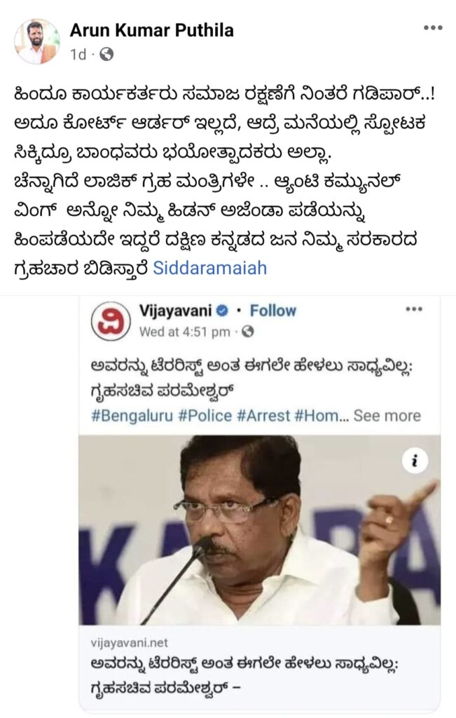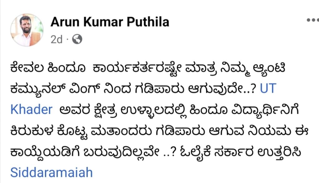 ಕಮ್ಯುನಲ್ ವಿಂಗ್ ನಿಂದ ಗಡಿಪಾರು ಆಗುವುದೇ..!?? ಉಳ್ಳಾಲದಲ್ಲಿ ಹಿಂದೂ ವಿದ್ಯಾರ್ಥಿನಿಗೆ ಕಿರುಕುಳ ಕೊಟ್ಟ ಮತಾಂಧರು ಗಡಿಪಾರು ಆಗುವ ನಿಯಮ ಈ ಕಾಯ್ದೆಯಡಿಗೆ ಬರುವುದಿಲ್ಲವೇ..!? ಓಲೈಕೆ ಸರ್ಕಾರ ಉತ್ತರಿಸಿ..!!’ ಎಂದು ಅವರು ತಮ್ಮ ಫೇಸ್ಬುಕ್ ಪೇಜ್ ನಲ್ಲಿ ಸರಕಾರದ ನಡೆಯ ಬಗ್ಗೆ ಅಸಮಾಧಾನ ವ್ಯಕ್ತಪಡಿಸಿದ್ದಾರೆ.