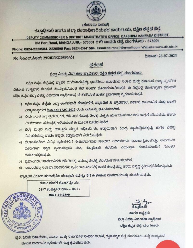 ಮಂಗಳೂರು : ದಕ್ಷಿಣ ಕನ್ನಡ ಜಿಲ್ಲೆಯಲ್ಲಿ ನಾಳೆ ಜುಲೈ 27 ರಂದು ವಿದ್ಯಾರ್ಥಿಗಳ ಹಿತದೃಷ್ಟಿಯಿಂದ ದಕ್ಷಿಣ ಕನ್ನಡ ಜಿಲ್ಲೆಯ ಎಲ್ಲಾ ಶಾಲೆಗಳಿಗೆ ಮಾತ್ರವೇ ರಜೆ ಘೋಷಣೆ ಮಾಡಲಾಗಿದೆ.