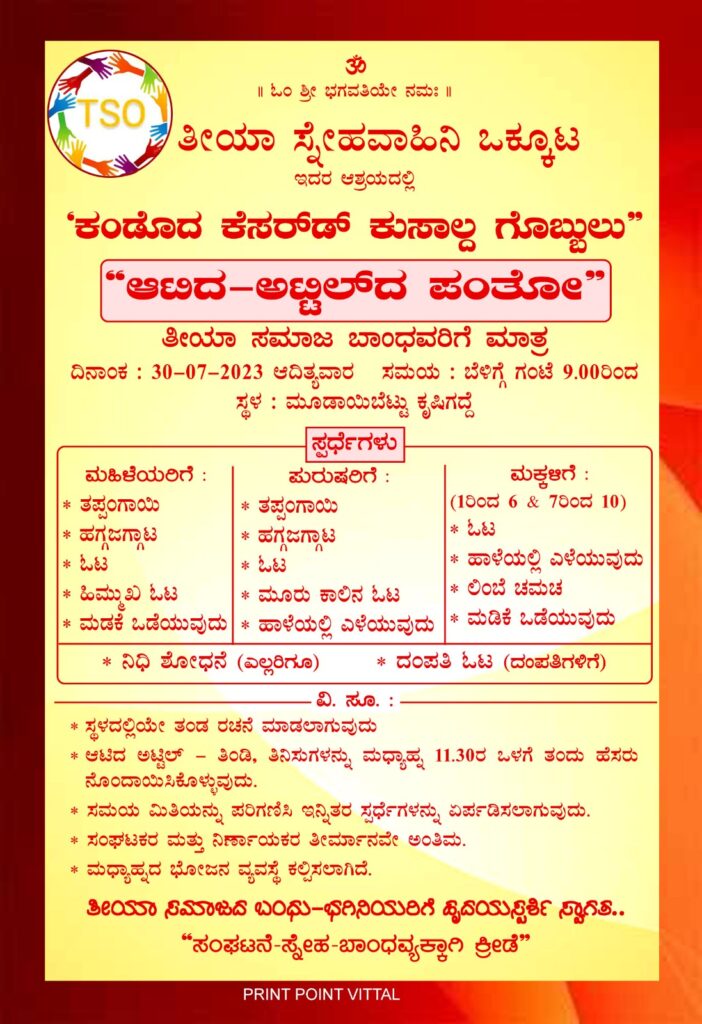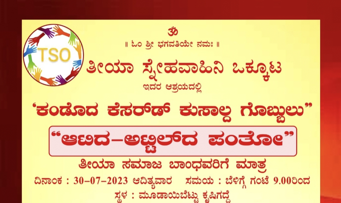 (ಜು.30) ಮೂಡಾಯಿಬೆಟ್ಟು: ತೀಯಾ ಸ್ನೇಹವಾಹಿನಿ ಒಕ್ಕೂಟದ ಆಶ್ರಯದಲ್ಲಿ ‘ಕಂಡೊದ ಕೆಸರ್ಡ್ ಕುಸಾಲ್ದ ಗೊಬ್ಬುಲು ‘ “ಆಟಿದ-ಅಟ್ಟಿಲ್ದ ಪಂತೋ”