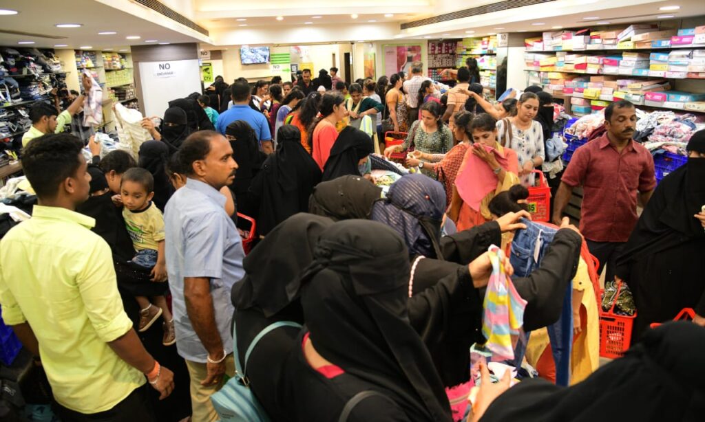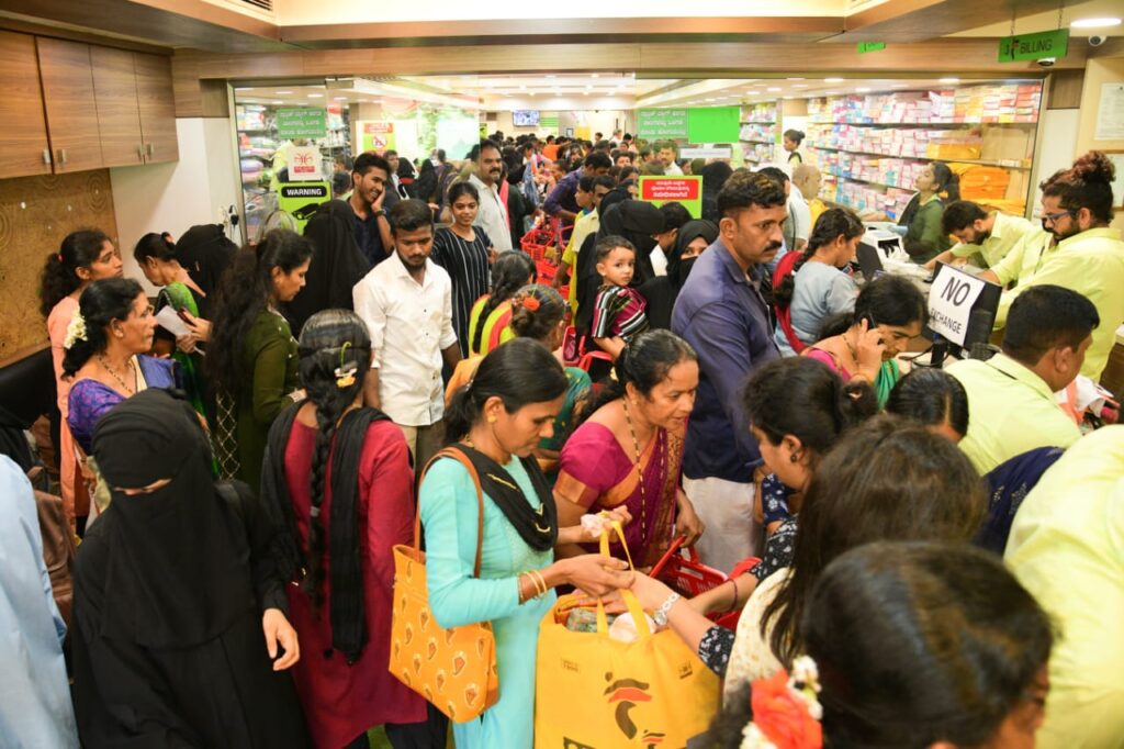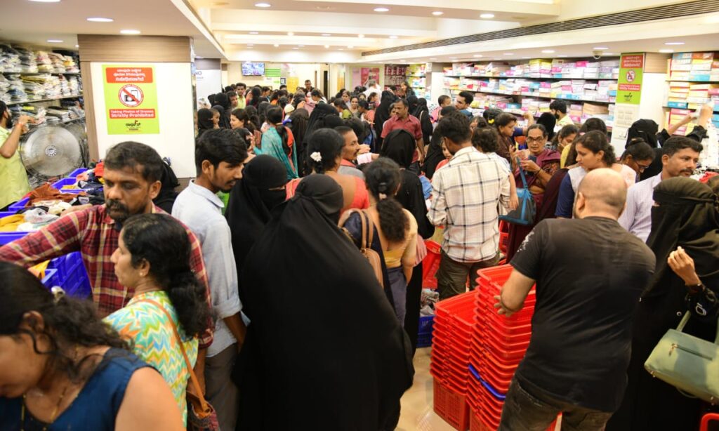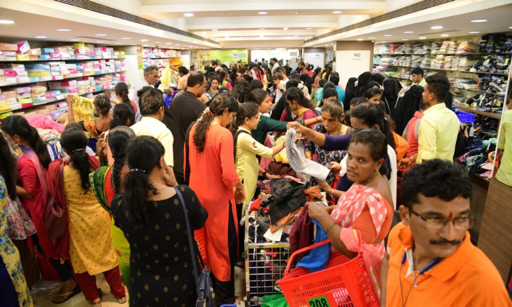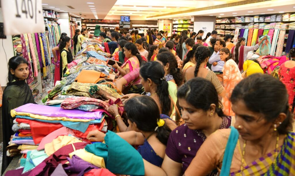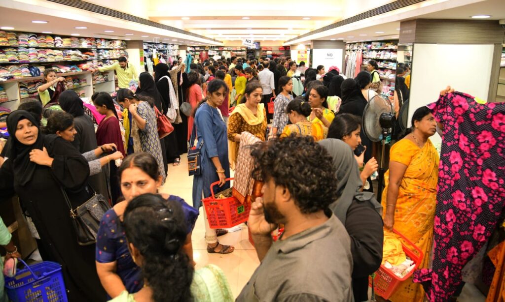 ಮಳಿಗೆಯು ಗ್ರಾಹಕರಿಂದ ತುಂಬಿ ತುಳುಕುತ್ತಿದ್ದು, ತಮ್ಮ ನೆಚ್ಚಿನ ವಸ್ತ್ರಗಳನ್ನು ಖರೀದಿ ಮಾಡಿ ಜನತೆ ಸಂಭ್ರಮಿಸುತ್ತಿದ್ದಾರೆ.