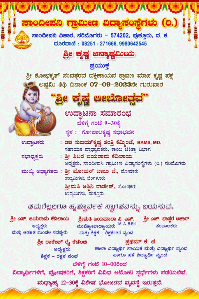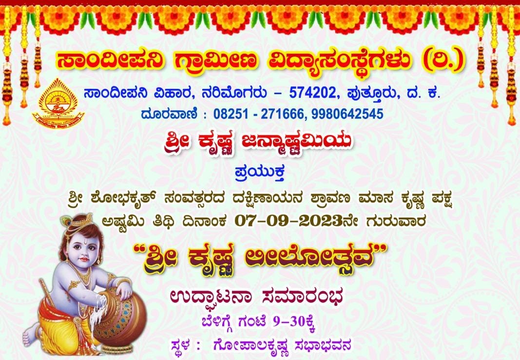 ಪುತ್ತೂರು : ಸಾಂದೀಪನಿ ಗ್ರಾಮೀಣ ವಿದ್ಯಾಸಂಸ್ಥೆಯಲ್ಲಿ ಶ್ರೀ ಕೃಷ್ಣ ಜನ್ಮಾಷ್ಠಮಿಯ ಪ್ರಯುಕ್ತ ‘ಶ್ರೀ ಕೃಷ್ಣ ಲೀಲೋತ್ಸವ’ ಕಾರ್ಯಕ್ರಮ ಸ.7 ರಂದು ಗೋಪಾಲಕೃಷ್ಣ ಸಭಾಭವನದಲ್ಲಿ ನಡೆಯಲಿದೆ.