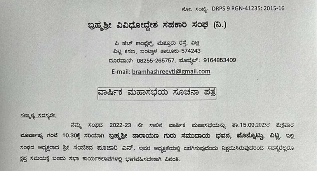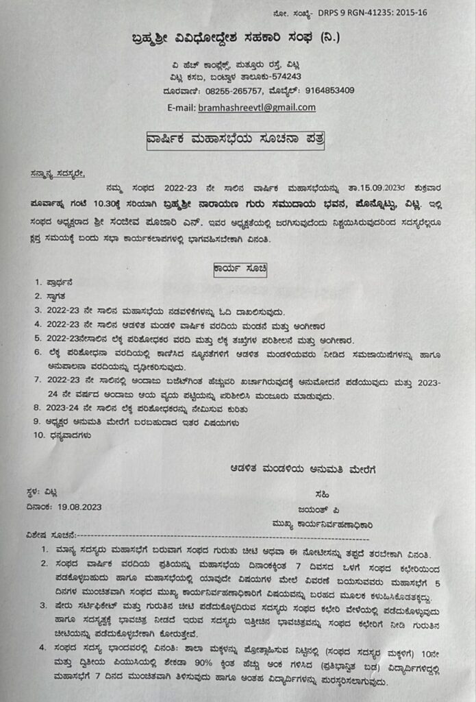 (ಸೆ.15) ವಿಟ್ಲ : ಬ್ರಹ್ಮಶ್ರೀ ವಿವಿಧೋದ್ದೇಶ ಸಹಕಾರಿ ಸಂಘದ ವಾರ್ಷಿಕ ಮಹಾಸಭೆ