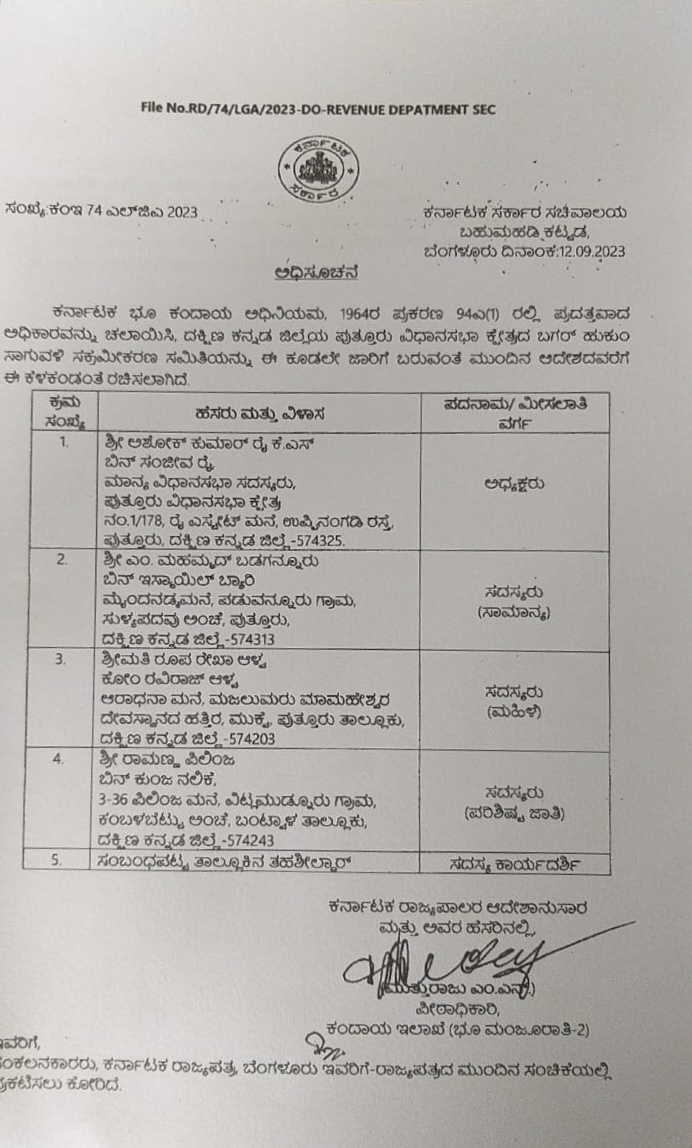 ಸಮಿತಿಯ ಅಧ್ಯಕ್ಷರಾಗಿ ಶಾಸಕ ಅಶೋಕ್ ಕುಮಾರ್ ರೈ, ಸದಸ್ಯರಾಗಿ ಎಂ. ಮಹಮ್ಮದ್ ಬಡಗನ್ನೂರು, ರೂಪ ರೇಖಾ ಆಳ್ವ, ರಾಮಣ್ಣ ಪಿಲಿಂಜ ಹಾಗೂ ಸದಸ್ಯ ಕಾರ್ಯದರ್ಶಿಯಾಗಿ ತಹಶೀಲ್ದಾರ್ ಅವರನ್ನು ನೇಮಕಗೊಳಿಸಿ ಆದೇಶ ಮಾಡಲಾಗಿದೆ.