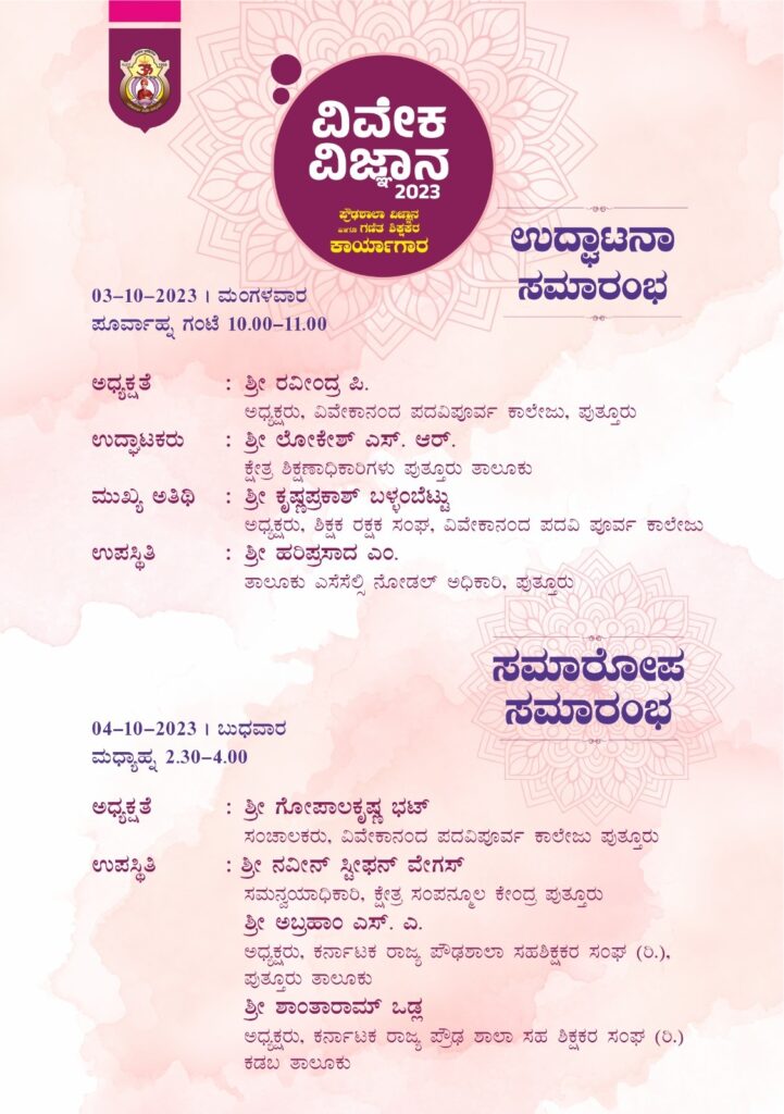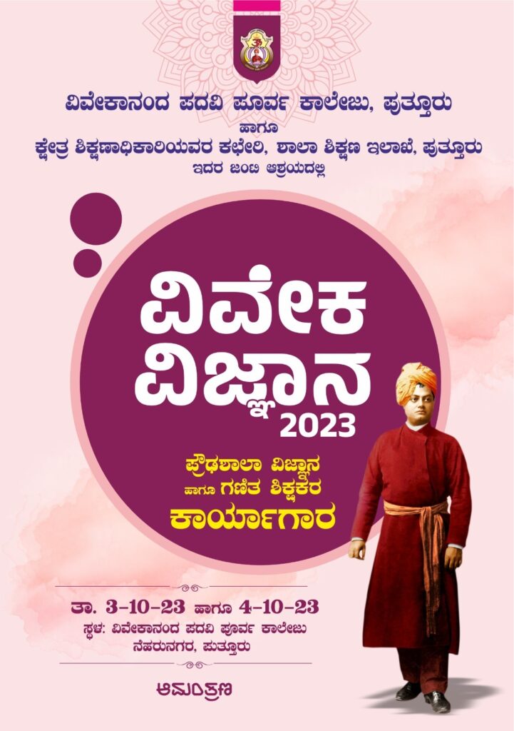 ಪುತ್ತೂರು : ವಿವೇಕಾನಂದ ಪದವಿಪೂರ್ವ ಕಾಲೇಜು ಮತ್ತು ಪುತ್ತೂರು ಕ್ಷೇತ್ರ ಶಿಕ್ಷಣಾಧಿಕಾರಿಯವರ ಕಛೇರಿ, ಶಾಲಾ ಶಿಕ್ಷಣ ಇಲಾಖೆ ಇದರ ಜಂಟಿ ಆಶ್ರಯದಲ್ಲಿ ಪುತ್ತೂರು ತಾಲೂಕಿನ ಮತ್ತು ಆಸುಪಾಸಿನ ಪ್ರೌಢಶಾಲಾ ವಿಜ್ಞಾನ & ಗಣಿತ ಅಧ್ಯಾಪಕರ ಕಾರ್ಯಾಗಾರ ವಿವೇಕ ವಿಜ್ಞಾನ 2023 ಕಾರ್ಯಕ್ರಮವು ಅಕ್ಟೋಬರ್ 3 ಮತ್ತು 4 ರಂದು ವಿವೇಕಾನಂದ ಪದವಿಪೂರ್ವ ಕಾಲೇಜಿನಲ್ಲಿ ನಡೆಯಲಿದೆ.