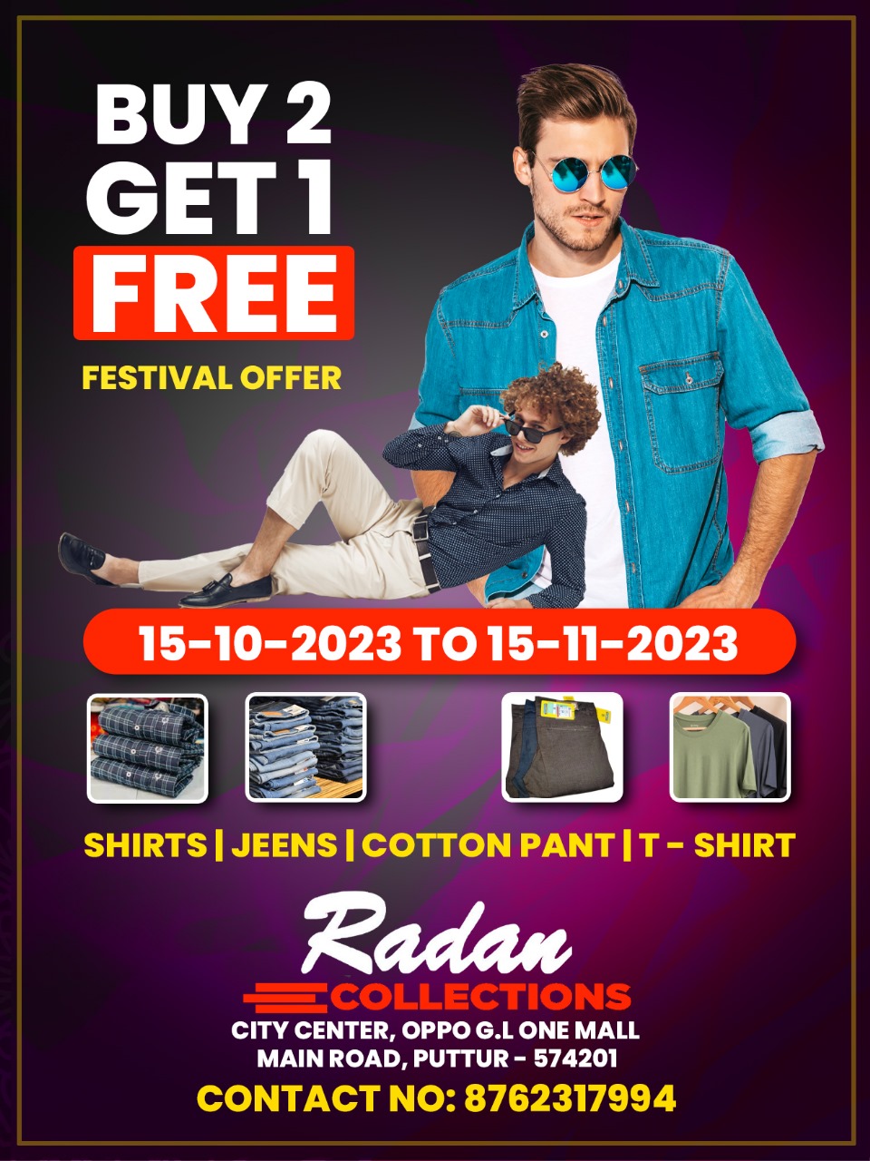 ಶರ್ಟ್ಸ್, ಜೀನ್ಸ್, ಕಾಟನ್ ಪ್ಯಾಂಟ್, ಟಿ-ಶರ್ಟ್ ಯಾವುದೇ ವಸ್ತ್ರಗಳಾದರೂ 2 ಕೊಂಡರೇ 1 ಉಚಿತ ( BUY 2 GET 1 FREE)..
