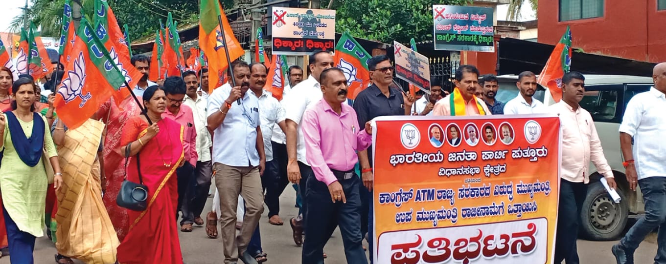 ಪುತ್ತೂರು : ರಾಜ್ಯದ ಕಾಂಗ್ರೆಸ್ ಸರಕಾರ ಕಮಿಷನ್ ದಂಧೆಯೊಂದಿಗೆ ಭ್ರಷ್ಟಾಚಾರ ಹಾಗೂ ಜನ ವಿರೋಧಿ ಆಡಳಿತ ನಡೆಸುತ್ತಿದೆ ಎಂದು ಖಂಡಿಸಿ ಬಿಜೆಪಿ ವತಿಯಿಂದ ಅಮರ್ ಜವಾನ್ ಸ್ಮಾರಕದ ಬಳಿ ಪ್ರತಿಭಟನೆ ನಡೆಯಿತು.
