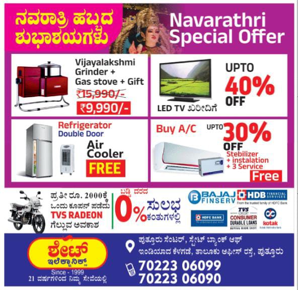 ಪುತ್ತೂರು : ನವರಾತ್ರಿ ಹಬ್ಬದ ಪ್ರಯುಕ್ತ ಶೇಟ್ ಇಲೆಕ್ಟ್ರಾನಿಕ್ಸ್ ಗ್ರಾಹಕರಿಗಾಗಿ ಡಿಸ್ಕೌಂಟ್ ಗಳ ಮಹಾಪೂರವನ್ನೇ ಹರಿಸಿದೆ.