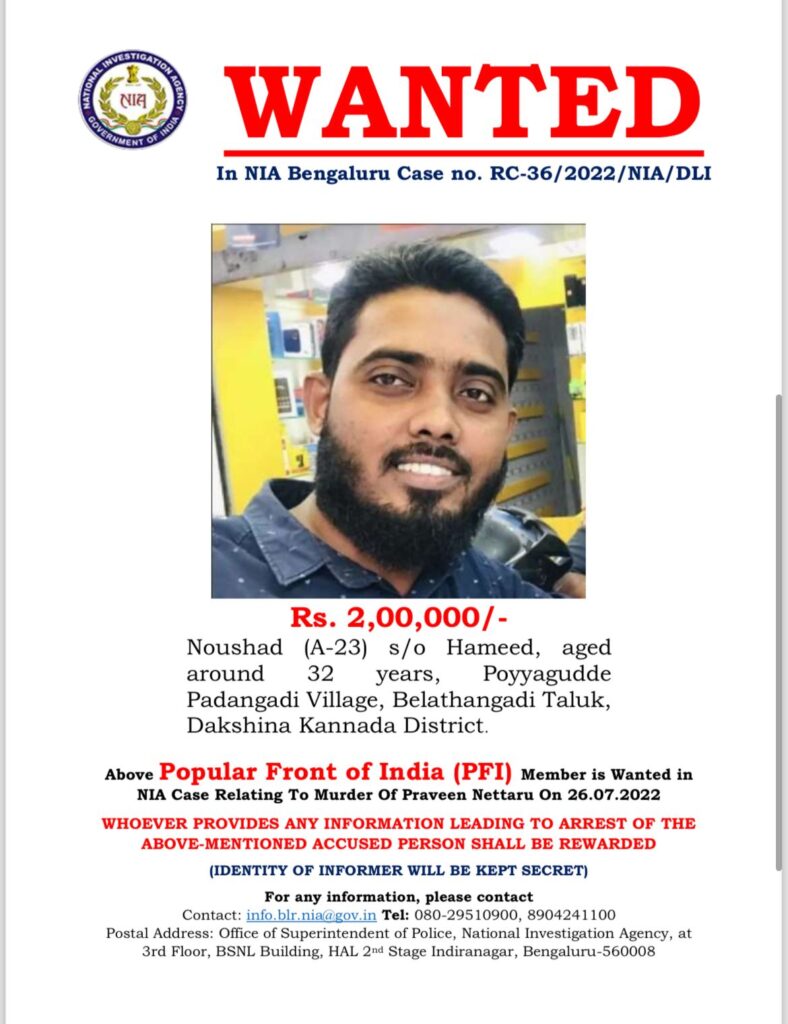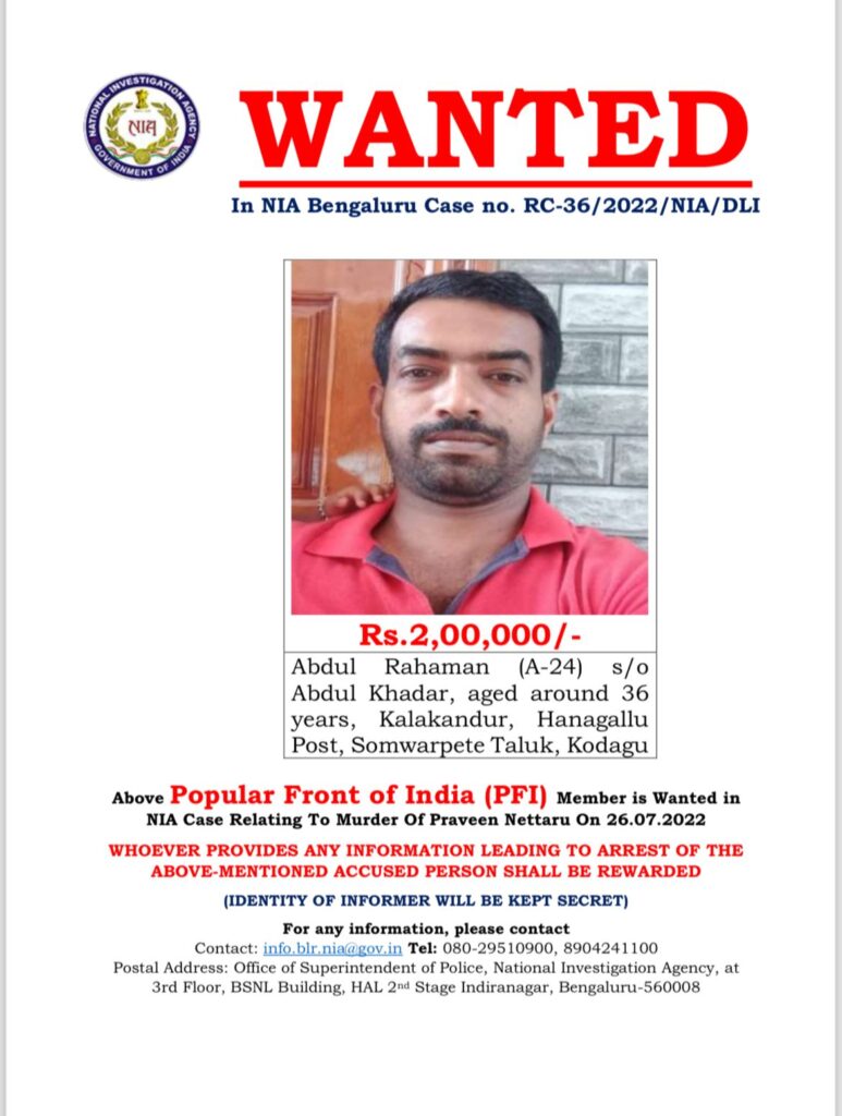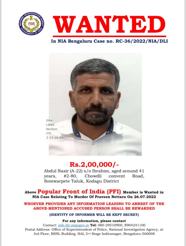 ಪುತ್ತೂರು : ಬಿಜೆಪಿ ಮುಖಂಡ ಪ್ರವೀಣ್ ನೆಟ್ಟಾರು ಹತ್ಯೆ ಪ್ರಕರಣಕ್ಕೆ ಸಂಬಂಧಿಸಿದಂತೆ ಎನ್ಐಎ ತನಿಖೆಯನ್ನು ತೀವ್ರಗೊಳಿಸಿದ್ದು, ಇದೀಗ ರಿವಾರ್ಡ್ ವಾಂಟೆಡ್ ನೋಟೀಸ್ ರಿಲೀಸ್ ಮಾಡಲಾಗಿದೆ.