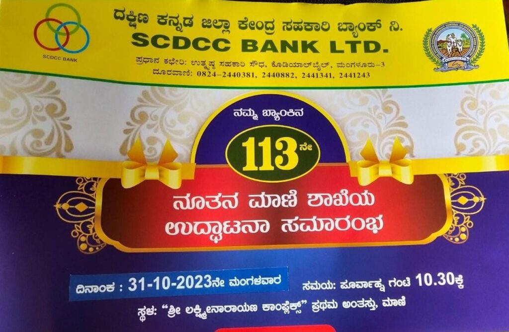 ಮಾಣಿ : ದಕ್ಷಿಣ ಕನ್ನಡ ಜಿಲ್ಲಾ ಕೇಂದ್ರ ಸಹಕಾರಿ ಬ್ಯಾಂಕ್ ನ 113ನೇ ಮಾಣಿ ಶಾಖೆಯ ಉದ್ಘಾಟನಾ ಸಮಾರಂಭವು ಅ.31 ರಂದು ಶ್ರೀ ಲಕ್ಷ್ಮೀ ನಾರಾಯಣ ಕಾಂಪ್ಲೆಕ್ಸ್ ನ ಪ್ರಥಮ ಅಂತಸ್ತಿನಲ್ಲಿ ನಡೆಯಲಿದೆ.