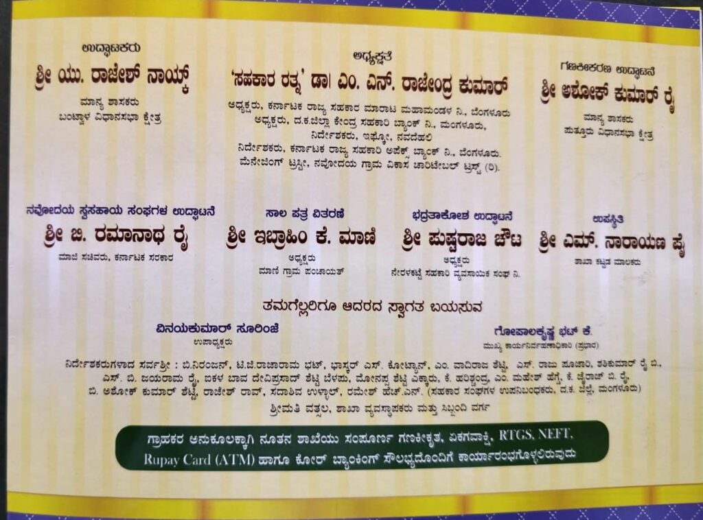 ನೂತನ ಶಾಖೆಯ ಉದ್ಘಾಟನೆಯನ್ನು ಬಂಟ್ವಾಳ ಶಾಸಕರಾದ ರಾಜೇಶ್ ನಾಯ್ಕ್ ರವರು ನೆರವೇರಿಸಲಿದ್ದಾರೆ.