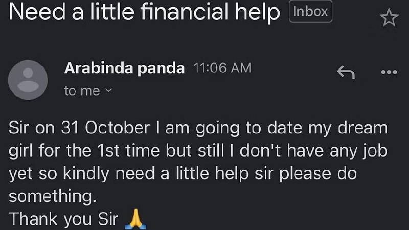 ಮೇಲ್ ಕಳುಹಿಸುವ ಮೂಲಕ ಅರಬಿಂದ ಪಾಂಡಾ ಸಹಾಯ ಕೇಳಿದ್ದಾನೆ. ಮೇಲ್ನಲ್ಲಿ ‘‘ಸರ್, ಅಕ್ಟೋಬರ್ 31ರಂದು ನಾನು ಮೊದಲ ಬಾರಿಗೆ ನನ್ನ ಕನಸಿನ ಹುಡುಗಿಯನ್ನು ಭೇಟಿಯಾಗಲಿದ್ದೇನೆ. ಆದರೆ ನನ್ನ ಕೈಯಲ್ಲಿ ಉದ್ಯೋಗವಿಲ್ಲ. ಆದ್ದರಿಂದ ದಯವಿಟ್ಟು ಸಹಾಯ ಮಾಡಿ. ಏನಾದರು ಮಾಡಿ ಸರ್’’ ಎಂದು ಕೇಳಿಕೊಂಡಿದ್ದಾನೆ.