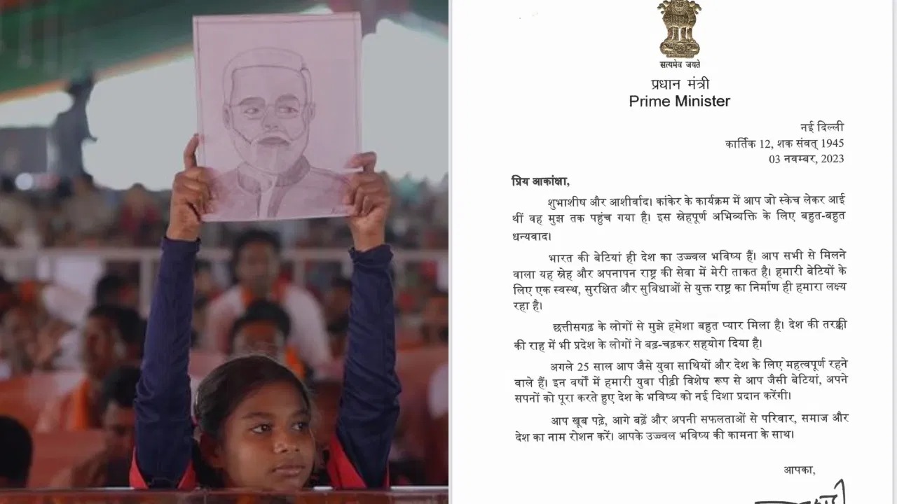 ‘ಪ್ರಿಯ ಆಕಾಂಕ್ಷಾ, ಶುಭ ಹಾರೈಕೆಗಳು ಮತ್ತು ಆಶೀರ್ವಾದಗಳು. ಕನ್ಕೇರ್‌ನಲ್ಲಿ ಕಾರ್ಯಕ್ರಮಕ್ಕೆ ನೀವು ತಂದಿದ್ದ ಸ್ಕೆಚ್ ನನಗೆ ತಲುಪಿದೆ. ಈ ಪ್ರೀತಿಯ ಅಭಿವ್ಯಕ್ತಿಗೆ ತುಂಬಾ ಧನ್ಯವಾದಗಳು. ಭಾರತದ ಹೆಣ್ಣುಮಕ್ಕಳು ದೇಶದ ಉಜ್ವಲ ಭವಿಷ್ಯ. ನಿಮ್ಮೆಲ್ಲರಿಂದ ನಾನು ಪಡೆಯುವ ಈ ಪ್ರೀತಿ ಮತ್ತು ವಾತ್ಸಲ್ಯವು ರಾಷ್ಟ್ರದ ಸೇವೆಯಲ್ಲಿ ನನ್ನ ಶಕ್ತಿಯಾಗಿದೆ. ನಮ್ಮ ಹೆಣ್ಣುಮಕ್ಕಳಿಗಾಗಿ ಆರೋಗ್ಯಕರ, ಸುರಕ್ಷಿತ ಮತ್ತು ಸುಸಜ್ಜಿತ ರಾಷ್ಟ್ರವನ್ನು ನಿರ್ಮಿಸುವುದು ನಮ್ಮ ಗುರಿಯಾಗಿದೆ. ನಾನು ಯಾವಾಗಲೂ ಛತ್ತೀಸ್‌ಗಢದ ಜನರಿಂದ ಬಹಳಷ್ಟು ಪ್ರೀತಿಯನ್ನು ಪಡೆದಿದ್ದೇನೆ. ದೇಶದ ಪ್ರಗತಿ ಪಥದಲ್ಲಿ ರಾಜ್ಯದ ಜನತೆ ಕೂಡ ಉತ್ಸಾಹದಿಂದ ಕೊಡುಗೆ ನೀಡಿದ್ದಾರೆ.