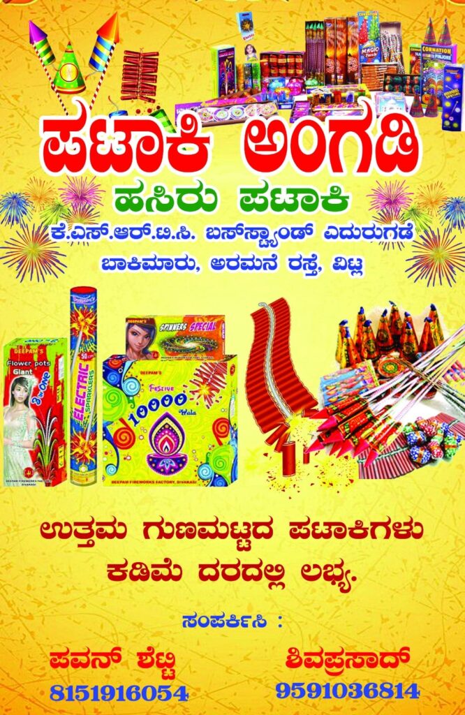 ವಿಟ್ಲ ಅರಮನೆ ರಸ್ತೆಯ ಬಾಕಿಮಾರು ( ಕೆ.ಎಸ್.ಆರ್.ಟಿ.ಸಿ ಬಸ್ ಸ್ಟ್ಯಾಂಡ್ ಎದುರು ) ‘ಪಟಾಕಿ ಅಂಗಡಿ’ಯಲ್ಲಿ ಉತ್ತಮ ಗುಣಮಟ್ಟದ ‘ಹಸಿರು ಪಟಾಕಿ’ಗಳು ಕಡಿಮೆ ದರದಲ್ಲಿ ಗ್ರಾಹಕರಿಗೆ ಲಭ್ಯವಾಗಲಿದೆ.