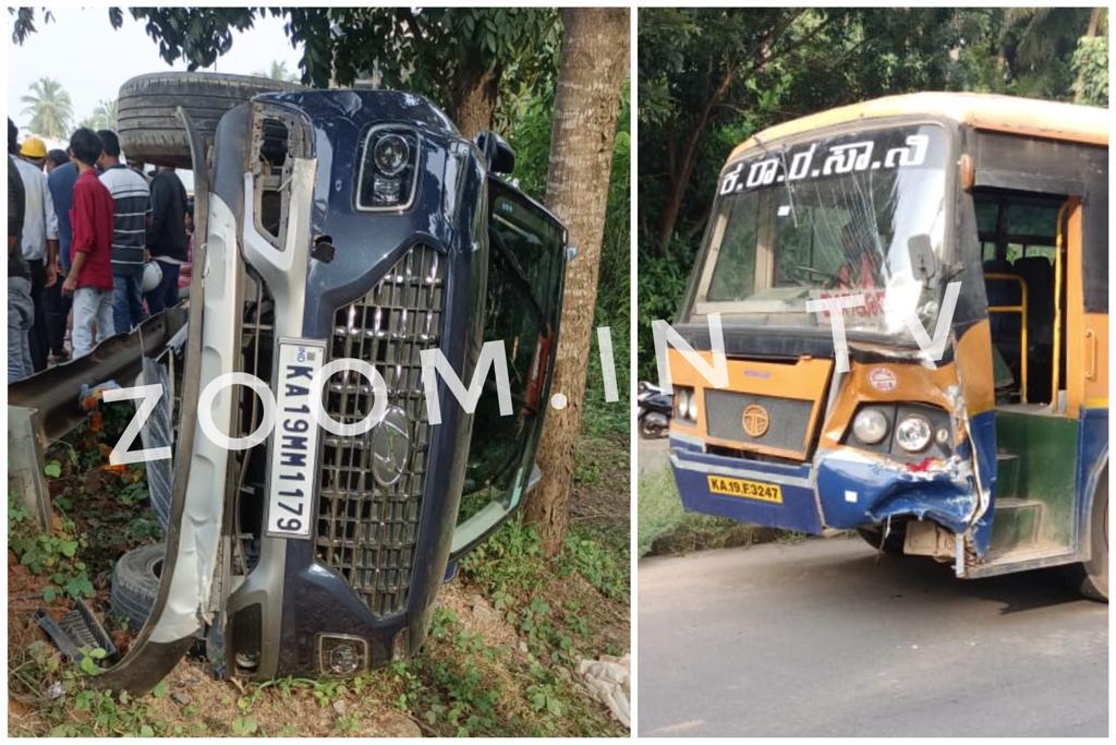 ಮಂಗಳೂರು ಕಡೆಗೆ ತೆರಳುತ್ತಿದ್ದ ಕಾರಿಗೆ ಕೆ.ಎಸ್.ಆರ್.ಟಿ.ಸಿ ಬಸ್ ಹಿಂಬದಿಯಿಂದ ಡಿಕ್ಕಿಯಾಗಿದೆ.