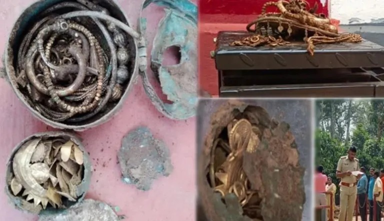 ದೇವಸ್ಥಾನ ಆವರಣದಲ್ಲಿ ಕಾರ್ಮಿಕರು ಕೆಲಸ ಮಾಡುತ್ತಿದ್ದಾಗ ಮಣ್ಣಿನ ಮಡಕೆಯಲ್ಲಿ ಚಿನ್ನದ ನಗನಾಣ್ಯ ಪತ್ತೆಯಾಗಿವೆ.