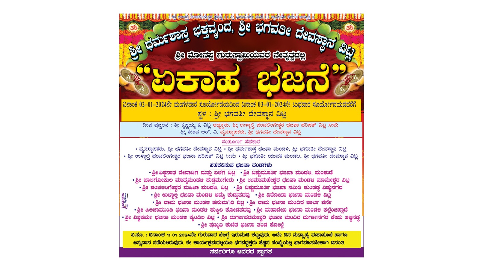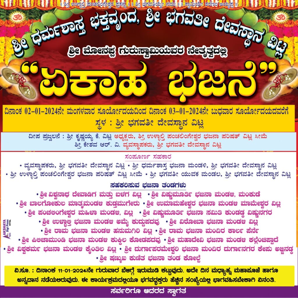ವಿಟ್ಲ : ಶ್ರೀ ಧರ್ಮಶಾಸ್ತ್ರ ಭಕ್ತವೃಂದ, ಶ್ರೀ ಭಗವತೀ ದೇವಸ್ಥಾನ ವಿಟ್ಲ ಹಾಗೂ ಶ್ರೀ ಮೋನಪ್ಪ ಗುರುಸ್ವಾಮಿಯವರ ನೇತೃತ್ವದಲ್ಲಿ ‘ಏಕಾಹ ಭಜನೆ’ ಜ.2 ಮಂಗಳವಾರ ಸುರ್ಯೋದಯದಿಂದ ಜ.3 ಬುಧವಾರ ಸುರ್ಯೋದಯದವರೆಗೆ ವಿಟ್ಲ ಶ್ರೀ ಭಗವತೀ ದೇವಸ್ಥಾನದಲ್ಲಿ ನಡೆಯಲಿದೆ.