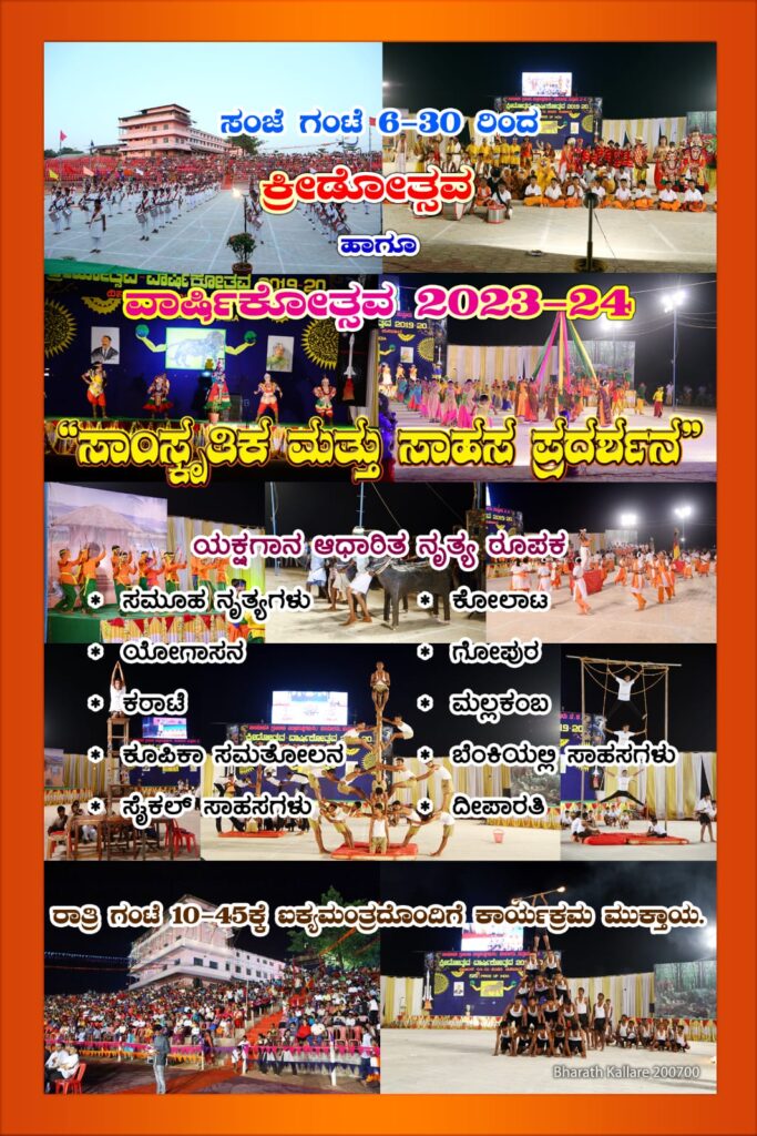 ಸಂಜೆ 6.30ರಿಂದ ಸಾಂಸ್ಕೃತಿಕ ಮತ್ತು ಸಾಹಸ ಪ್ರದರ್ಶನ, ಯಕ್ಷಗಾನ ಆಧಾರಿತ ನೃತ್ಯ ರೂಪಕ, ಸಮೂಹ ನೃತ್ಯಗಳು, ಯೋಗಾಸನ, ಕರಾಟೆ, ರೂಪಿಕಾ ಸಮತೋಲನ, ಬೆಂಕಿಯಲ್ಲಿ ಸಾಹಸಗಳು, ಕೋಲಾಟ, ಗೋಪುರ, ಮಲ್ಲಕಂಬ, ತಾಲೀಮು, ಸೈಕಲ್ ಸಾಹಸಗಳು, ದೀಪಾರತಿ ನಡೆಯಲಿದೆ ಎಂದು ಸಂಸ್ಥೆಯ ಪ್ರಕಟಣೆ ತಿಳಿಸಿದೆ.
