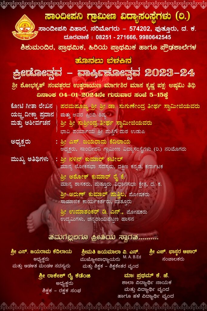 ಪುತ್ತೂರು : ನರಿಮೊಗರು ಸಾಂದೀಪನಿ ಗ್ರಾಮೀಣ ವಿದ್ಯಾಸಂಸ್ಥೆಯಲ್ಲಿ ಶಿಶುಮಂದಿರ, ಪ್ರಾಥಮಿಕ, ಹಿರಿಯ ಪ್ರಾಥಮಿಕ ಹಾಗೂ ಪ್ರೌಢಶಾಲೆಗಳ ಹೊನಲು ಬೆಳಕಿನ ಕ್ರೀಡೋತ್ಸವ-ವಾರ್ಷಿಕೋತ್ಸವ ಜ.4 ರಂದು ನಡೆಯಲಿದೆ.