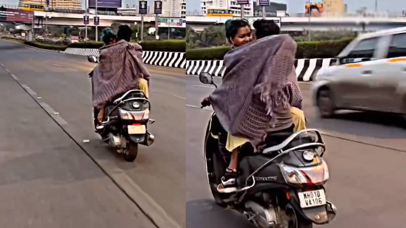 ಯುವಕನೋರ್ವ ಚಲಿಸುವ ರಸ್ತೆಯಲ್ಲಿ ತನ್ನ ಲವ್ವರನ್ನು ತೊಡೆ ಮೇಲೆ ಕೂರಿಸಿಕೊಂಡು, ಮೈಮೇಲೆ ಕಂಬಳಿ ಹೊದ್ದುಕೊಂಡು ಚುಂಬಿಸಿದ್ದಾರೆ. ಈ ದೃಶ್ಯ ಸಾರ್ವಜನಿಕರ ಮೊಬೈಲ್ನಲ್ಲಿ ಸೆರೆಯಾಗಿದೆ. ಅದರಲ್ಲೂ ಈ ಜೋಡಿ ಹೆಲ್ಮೆಟ್ ಧರಿಸದೆ ನಡು ರಸ್ತೆಯಲ್ಲಿ ಸರ್ಕಸ್ ಮಾಡಿದ್ದಾರೆ.