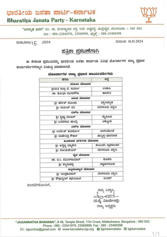 ಈ ಬಗ್ಗೆ ಬಿಜೆಪಿ ಪ್ರಕಟಣೆಯಲ್ಲಿ ತಿಳಿಸಿದೆ.