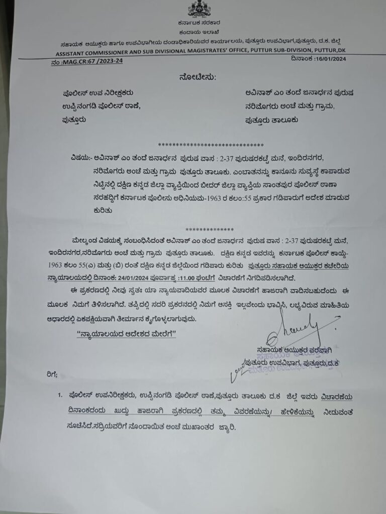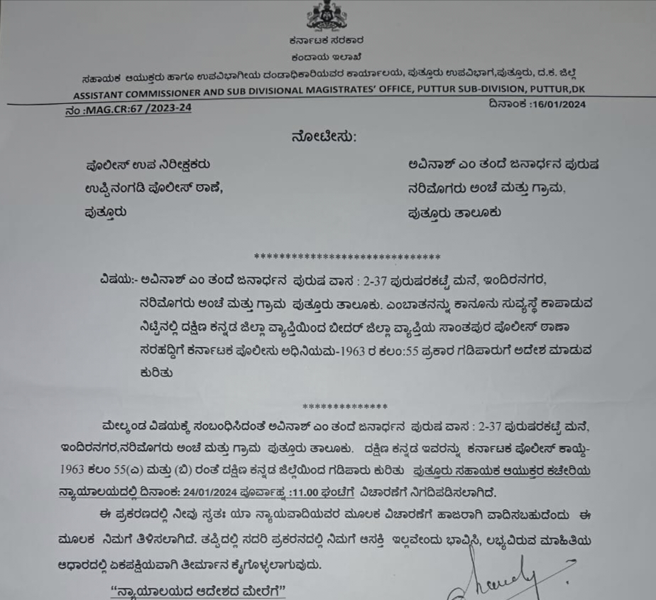 ಪುತ್ತೂರು : ಹಿಂದೂ ಮುಖಂಡ ಅವಿನಾಶ್ ಅವರಿಗೆ ಗಡಿಪಾರು ನೋಟೀಸ್ ಜಾರಿ ಮಾಡಲಾಗಿದೆ.