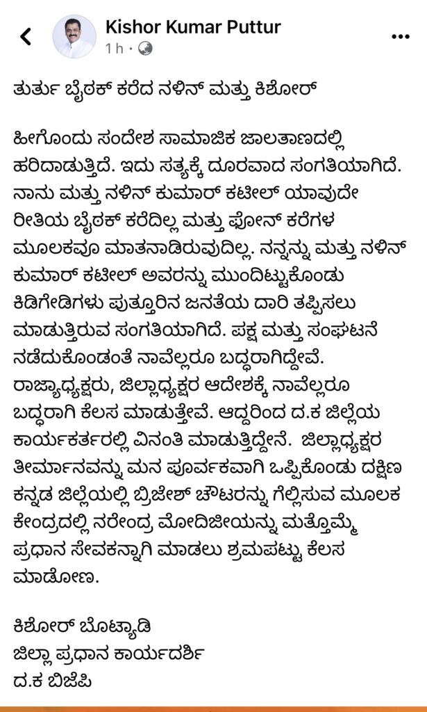 ತಮ್ಮ ಫೇಸ್ಬುಕ್ ಖಾತೆ ಈ ಬಗ್ಗೆ ಮಾಹಿತಿ ಹಂಚಿಕೊಂಡ ಕಿಶೋರ್ ಬೊಟ್ಯಾಡಿ ಅವರು ‘ನಾನು ಮತ್ತು ನಳಿನ್ ಕುಮಾರ್ ಕಟೀಲ್ ಅವರು ಯಾವುದೇ ರೀತಿಯ ಬೈಠಕ್ ಕರೆದಿಲ್ಲ ಮತ್ತು ಫೋನ್ ಕರೆಗಳ ಮೂಲಕವೂ ಮಾತನಾಡಿರುವುದಿಲ್ಲ. ನನ್ನನ್ನು ಮತ್ತು ನಳಿನ್ ಕುಮಾರ್ ಕಟೀಲ್ ಅವರನ್ನು ಮುಂದಿಟ್ಟುಕೊಂಡು ಕಿಡಿಗೇಡಿಗಳು ಪುತ್ತೂರಿನ ಜನತೆಯ ದಾರಿ ತಪ್ಪಿಸಲು ಮಾಡುತ್ತಿರುವ ಸಂಗತಿಯಾಗಿದೆ.