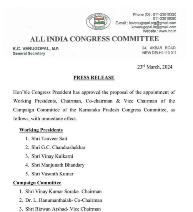 ಕಾರ್ಯಾಧ್ಯಕ್ಷರಾಗಿ ಶಾಸಕ ತನ್ವಿರ್ ಸೇಟ್, ರಾಜ್ಯಸಭಾ ಸದಸ್ಯ ಜಿ ಸಿ ಚಂದ್ರಶೇಖರ್, ಶಾಸಕ ವಿನಯ್ ಕುಲಕರ್ಣಿ, ವಿಧಾನ ಪರಿಷತ್ ಸದಸ್ಯ ಮಂಜುನಾಥ್ ಭಂಡಾರಿ ಮತ್ತು ಕೆಪಿಸಿಸಿ ಪ್ರಧಾನ ಕಾರ್ಯದರ್ಶಿ ವಸಂತ್ ಕುಮಾರ್ ರಾಯಚೂರು ಅವರನ್ನು ನೇಮಕಗೊಳಿಸಲಾಗಿದೆ.