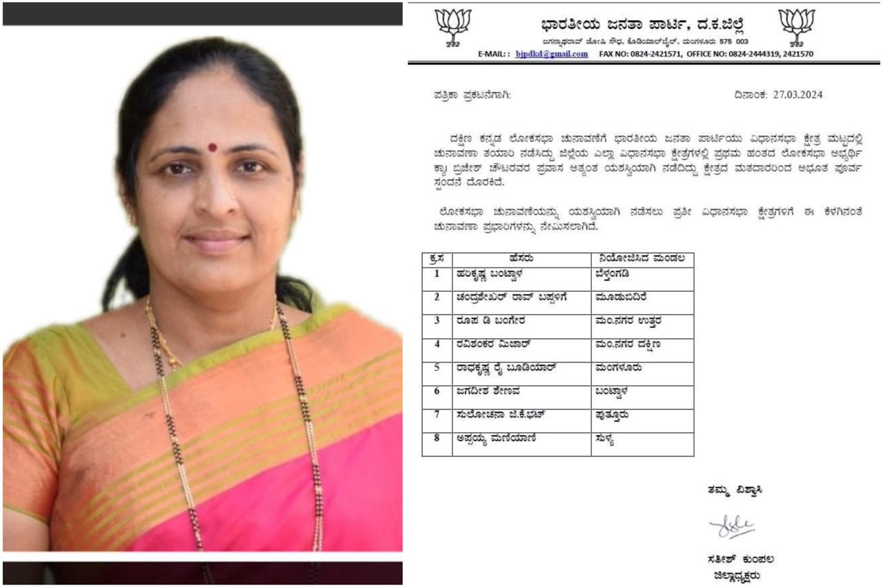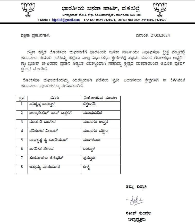 ದಕ್ಷಿಣ ಕನ್ನಡ ಬಿಜೆಪಿ ಚುನಾವಣಾ ಪ್ರಭಾರಿಗಳ ವಿವರ.. :