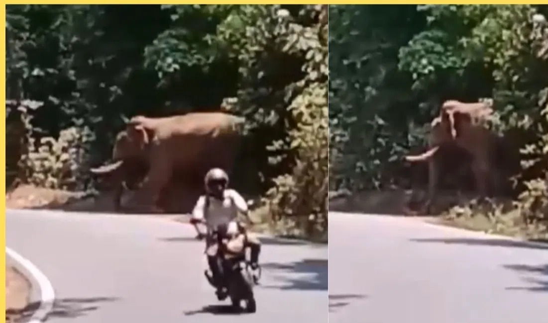 ಆನೆಯನ್ನು ಗಮನಿಸಿದ ವಾಹನ ಸವಾರರು ತಮ್ಮ ವಾಹನಗಳನ್ನು ತಡೆದು ರಸ್ತೆ ದಾಟಲು ಅನುವು ಮಾಡಿಕೊಟ್ಟರು. ಆದರೆ, ಬೈಕ್ ಸವಾರರೊಬ್ಬರು ತಿರುವಿನಲ್ಲಿ ಆನೆ ನಿಂತಿರುವುದನ್ನು ಕಾಣದೆ, ಸಂಚರಿಸಿದ್ದಾರೆ. ಅದೃಷ್ಟವಶಾತ್ ಆನೆಯ ದಾಳಿಯಿಂದ ಸ್ವಲ್ಪದರಲ್ಲೇ ಪಾರಾಗಿದ್ದಾರೆ. ಈ ಸಿನಿಮೀಯ ದೃಶ್ಯ ಕ್ಯಾಮರಾದಲ್ಲಿ ಸೆರೆಯಾಗಿದ್ದು, ಅದರ ವೀಡಿಯೋ ಸಾಮಾಜಿಕ ಜಾಲತಾಣಗಳಲ್ಲಿ ವೈರಲ್ ಆಗುತ್ತಿದೆ.