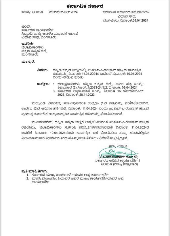 ದಕ್ಷಿಣ ಕನ್ನಡ ಜಿಲ್ಲೆಗೆ ಅನ್ವಯಿಸುವಂತೆ ಖುತುಬ್-ಎ-ರಂಜಾನ್ ಹಬ್ಬದ ರಜೆಯನ್ನು ಜಿಲ್ಲಾಧಿಕಾರಿಗಳು ಸ್ಥಳೀಯ ಪರಿಸ್ಥಿತಿಗಳಿಗನುಸಾರವಾಗಿ ಏ.11ರ ಬದಲಿಗೆ ಏ.10 ರಂದು ಸಾರ್ವತ್ರಿಕ ರಜೆ ಘೋಷಿಸಲು ನಿಯಮಾನುಸಾರ ತೀರ್ಮಾನ ತೆಗೆದುಕೊಳ್ಳುವಂತೆ ನಿರ್ದೇಶಿಸಿದ್ದು, ಈ ಹಿನ್ನೆಲೆ ದಕ್ಷಿಣ ಕನ್ನಡ ಜಿಲ್ಲೆಯಲ್ಲಿ ಇಂದು ಸಾರ್ವತ್ರಿಕ ರಜೆ ಘೋಷಣೆ ಮಾಡಲಾಗಿದೆ.