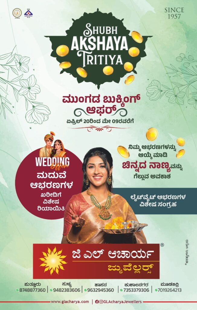 ಎಲ್ಲಾ ಮಳಿಗೆಗಳಾದ ಪುತ್ತೂರು, ಮೂಡಬಿದ್ರೆ, ಸುಳ್ಯ, ಕುಶಾಲನಗರ ಹಾಗೂ ಹಾಸನದಲ್ಲಿಯೂ ಈ ರಿಯಾಯಿತಿ ಆಫರ್ ಲಭ್ಯವಿದೆ. ಸಂಸ್ಕೃತದಲ್ಲಿ ಅಕ್ಷಯ ಎಂದರೆ ಶಾಶ್ವತ ಎಂದರ್ಥ ಅಕ್ಷಯ ತೃತೀಯ ಎಂಬುವುದು ಶುಭದ ಸಂಕೇತವಾಗಿದೆ. ಈ ಸಂದರ್ಭದಲ್ಲಿ ಜನರು ಚಿನ್ನ ಬೆಳ್ಳಿಯಂತಹ ಅಮೂಲ್ಯ ಲೋಹಗಳನ್ನು ಖರೀದಿಸುತ್ತಾರೆ ಏಕೆಂದರೆ ಇದು ಕುಟುಂಬಕ್ಕೆ ಸಮೃದ್ಧಿ ಮತ್ತು ಆದೃಷ್ಟವನ್ನು ತರುತ್ತದೆ ಎಂಬುದು ನಂಬಿಕೆ ಆದುದರಿಂದ ಜಿ.ಎಲ್. ಆಚಾರ್ಯ ಜ್ಯುವೆಲ್ಲರ್ಸ್ ತಮ್ಮೆಲ್ಲ ನೆಚ್ಚಿನ ಗ್ರಾಹಕರಿಗೆ ಅಕ್ಷಯ ತೃತೀಯ ಪ್ರಯುಕ್ತ ಮುಂಗಡ ಬುಕ್ಕಿಂಗ್ ಆಫರ್, ಮದುವೆ ಆಭರಣಗಳ ಖರೀದಿಗೆ ವಿಶೇಷ ರಿಯಾಯಿತಿ ಹಾಗೂ ಗ್ರಾಹಕರಿಗೆ ಮೆಚ್ಚಿನ ಆಭರಣಗಳನ್ನು ಆಯ್ಕೆ ಮಾಡಿ ಚಿನ್ನದ ನಾಣ್ಯವನ್ನು ಗೆಲ್ಲುವ ಸುವರ್ಣವಕಾಶ ಕಲ್ಪಿಸಿದೆ.