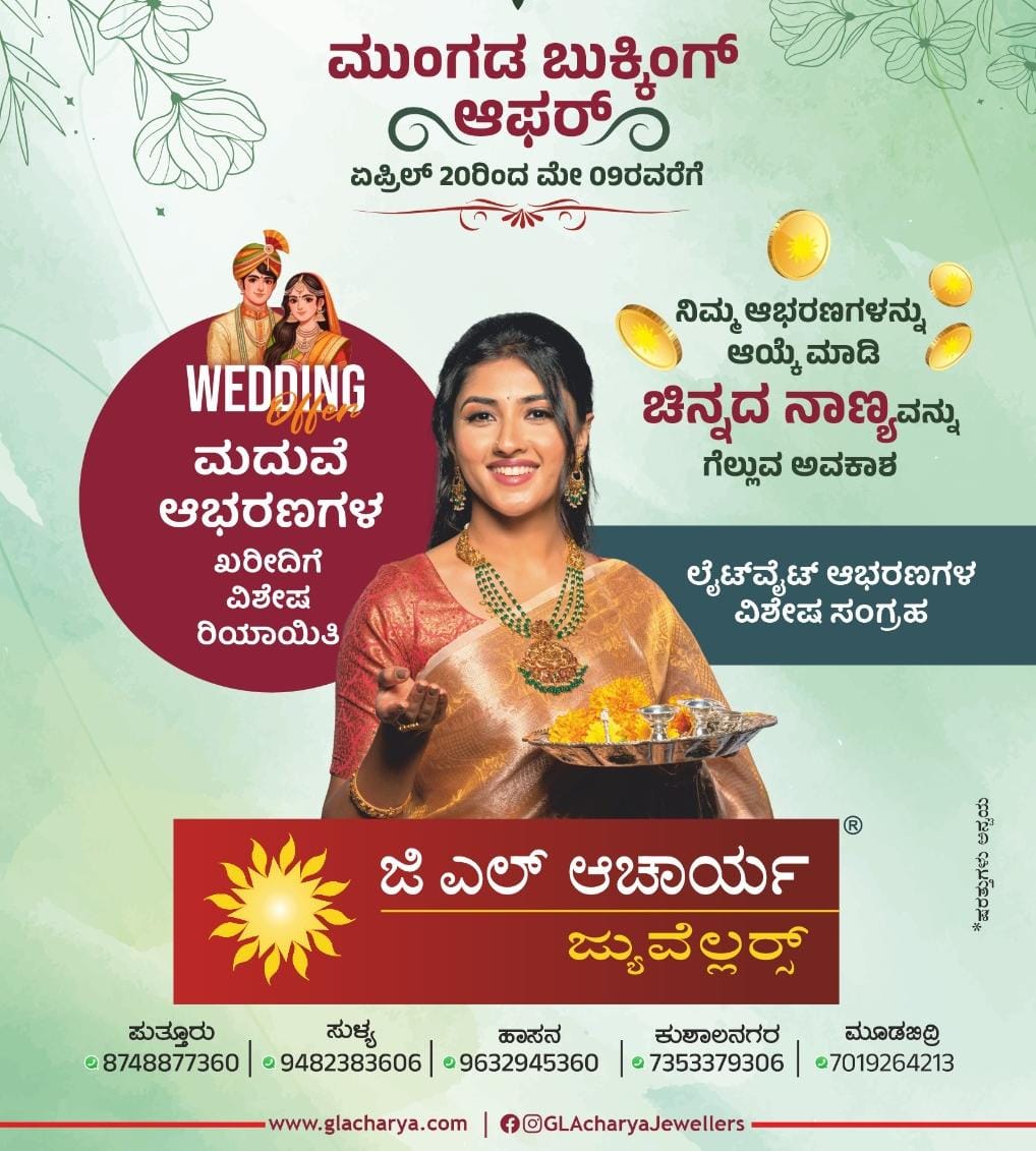 ಪುತ್ತೂರು : ಪ್ರತಿಷ್ಠಿತ ಚಿನ್ನಾಭರಣಗಳ ಮಳಿಗೆ ಜಿ.ಎಲ್. ಆಚಾರ್ಯ ಜ್ಯುವೆಲ್ಲರ್ಸ್ ನಲ್ಲಿ ಗ್ರಾಹಕರಿಗೆ ಅಕ್ಷಯ ತೃತೀಯ ಪ್ರಯುಕ್ತ ಮುಂಗಡ ಬುಕ್ಕಿಂಗ್ ಆಫರ್ ಏಪ್ರಿಲ್ 20ರಿಂದ ಮೇ.9ರವರೆಗೆ ಲಭ್ಯವಿದೆ.