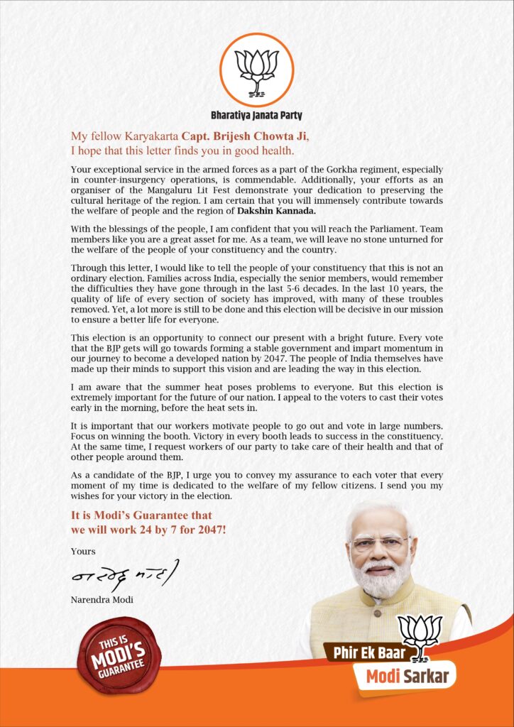 ಮಂಗಳೂರು : ದಕ್ಷಿಣ ಕನ್ನಡ ಬಿಜೆಪಿ ಅಭ್ಯರ್ಥಿ ಕ್ಯಾ. ಬ್ರಿಜೇಶ್‌ ಚೌಟ ಅವರಿಗೆ ಪ್ರಧಾನಿ ನರೇಂದ್ರ ಮೋದಿ ಪತ್ರ ಬರೆದಿದ್ದು, ಚೌಟ ಸೇನಾ ಹಿನ್ನೆಲೆ ಹೊಂದಿರುವ ಅಭ್ಯರ್ಥಿ ಎನ್ನುವ ಬಗ್ಗೆ ಮೆಚ್ಚುಗೆಯ ಮಾತುಗಳನ್ನಾಡಿದ್ದಾರೆ.