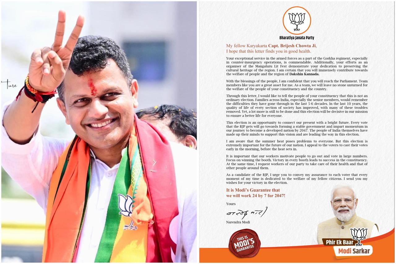 ಭಾರತೀಯ ಭೂ ಸೇನೆಯಲ್ಲಿ ಪ್ರತಿದಾಳಿ ಕಾರ್ಯಾಚರಣೆಗೆ ಹೆಸರಾಗಿರುವ “ಗೂರ್ಖಾ ರೆಜಿಮೆಂಟ್‌’ನಲ್ಲಿ ಸೇವೆ ಸಲ್ಲಿಸಿರುವುದು ಶ್ಲಾಘನೀಯ. ಅಲ್ಲದೆ, ‘ಮಂಗಳೂರು ಲಿಟ್‌ ಫೆಸ್ಟ್‌’ ಆಯೋಜಿಸುವ ಮೂಲಕ ಸಾಹಿತ್ಯ, ಸಂಸ್ಕೃತಿ ಕುರಿತ ಬದ್ಧತೆ ತೋರಿಸಿದ್ದೀರಿ. ದಕ್ಷಿಣ ಕನ್ನಡ ಜಿಲ್ಲೆಯ ಅಭಿವೃದ್ಧಿ ಮತ್ತು ಜನರ ಕಲ್ಯಾಣಕ್ಕಾಗಿ ನೀವು ತೊಡಗಿಸಿಕೊಳ್ಳುತ್ತೀರಿ ಎಂದು ಖಚಿತವಾಗಿ ಹೇಳಬಲ್ಲೆ ಎಂದು ಮೋದಿ ಪತ್ರದಲ್ಲಿ ತಿಳಿಸಿದ್ದಾರೆ.