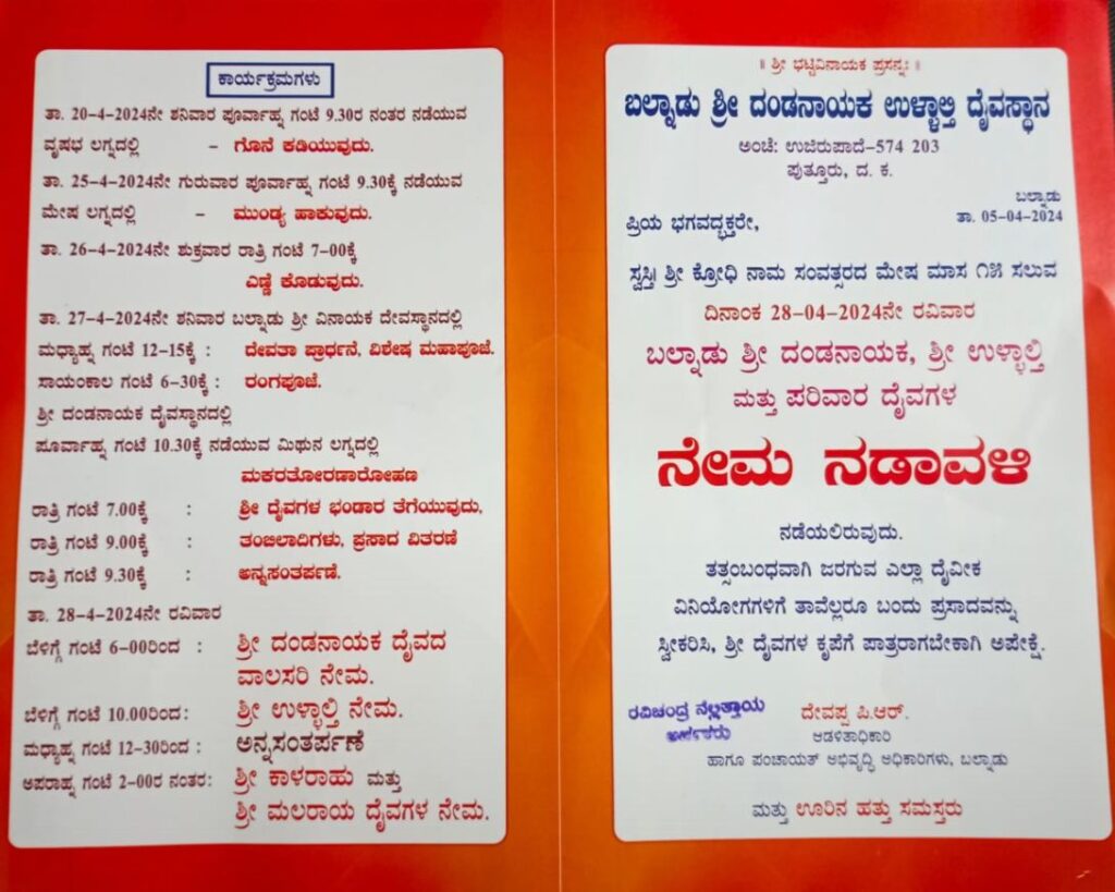 ಏ.28 ರಂದು ಬೆಳಿಗ್ಗೆ 6 ಗಂಟೆಯಿಂದ ಶ್ರೀ ದಂಡನಾಯಕ ದೈವದ ವಾಲಸರಿ ನೇಮ ನಡೆಯಲಿದೆ.