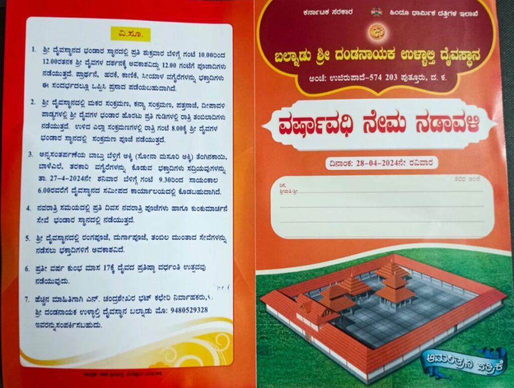 ಪುತ್ತೂರು : ಬಲ್ನಾಡು ಶ್ರೀ ದಂಡನಾಯಕ ಉಳ್ಳಾಲ್ತಿ ದೈವಸ್ಥಾನದಲ್ಲಿ ವರ್ಷಾವಧಿ ನೇಮ ನಡಾವಳಿಯು ಏ.28 ರಂದು ನಡೆಯಲಿದೆ.