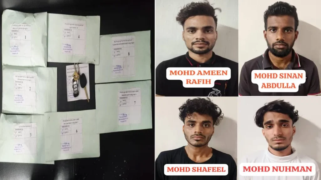 ಮೊಹಮ್ಮದ್ ಅಮೀನ್ ರಾಫಿ(23), ವಾಸ: 2-14-1236, ಬಿಜೈ ನ್ಯೂ ರೋಡ್, 2ನೇ A ಕ್ರಾಸ್, ಬಿಜೈ ಚರ್ಚ್ ಹತ್ತಿರ, ಬಿಜೈ, ಮಂಗಳೂರು. ಮೊಹಮ್ಮದ್ ಸಿನಾನ್ ಅಬ್ದುಲ್ಲಾ(23), ವಾಸ: ಬಂಡ್ಸಾಲೆ ಹೌಸ್, ಅಡ್ಡೂರು ಗ್ರಾಮ, ಮಂಗಳೂರು. ಮೊಹಮ್ಮದ್ ನೌಮಾನ್(22), ವಾಸ: 201, ಬಾವಾ ಮಹಲ್, ಜೆ.ಎಂ.ಕ್ರಾಸ್ ರಸ್ತೆ,ಬಂದರು, ಮಂಗಳೂರು. ಮೊಹಮ್ಮದ್ ಸಫೀಲ್(23), ವಾಸ: ಕಂಡಿಮಾರ್ ಹೌಸ್, ಸ್ಟೋರ್ ಹೌಸ್ ಹತ್ತಿರ, ಬೋಳಿಯಾರ್ ಪೋಸ್ಟ್ ಮತ್ತು ಗ್ರಾಮ, ಉಳ್ಳಾಲ ತಾಲೂಕು. ಎಂಬವರನ್ನು ವಶಕ್ಕೆ ಪಡೆದುಕೊಂಡು ಅವರ ವಶದಿಂದ 6,50,000/- ರೂ ಮೌಲ್ಯದ 270 ಗ್ರಾಂ ನಿಷೇಧಿತ ಮಾದಕ ವಸ್ತು ಎಂಡಿಎಂಎ, 4 ಮೊಬೈಲ್ ಫೋನ್ ಗಳು, ಟೊಯೊಟಾ ಕೊರೊಲ್ಲಾ ಕಾರು, ಡಿಜಿಟಲ್ ತೂಕ ಮಾಪಕವನ್ನು ಸ್ವಾಧೀನಪಡಿಸಿಕೊಳ್ಳಲಾಗಿದೆ. ವಶಪಡಿಸಿಕೊಂಡ ಸೊತ್ತಿನ ಒಟ್ಟು ಮೌಲ್ಯ ರೂ. 14,85,500/- ಆಗಬಹುದು.